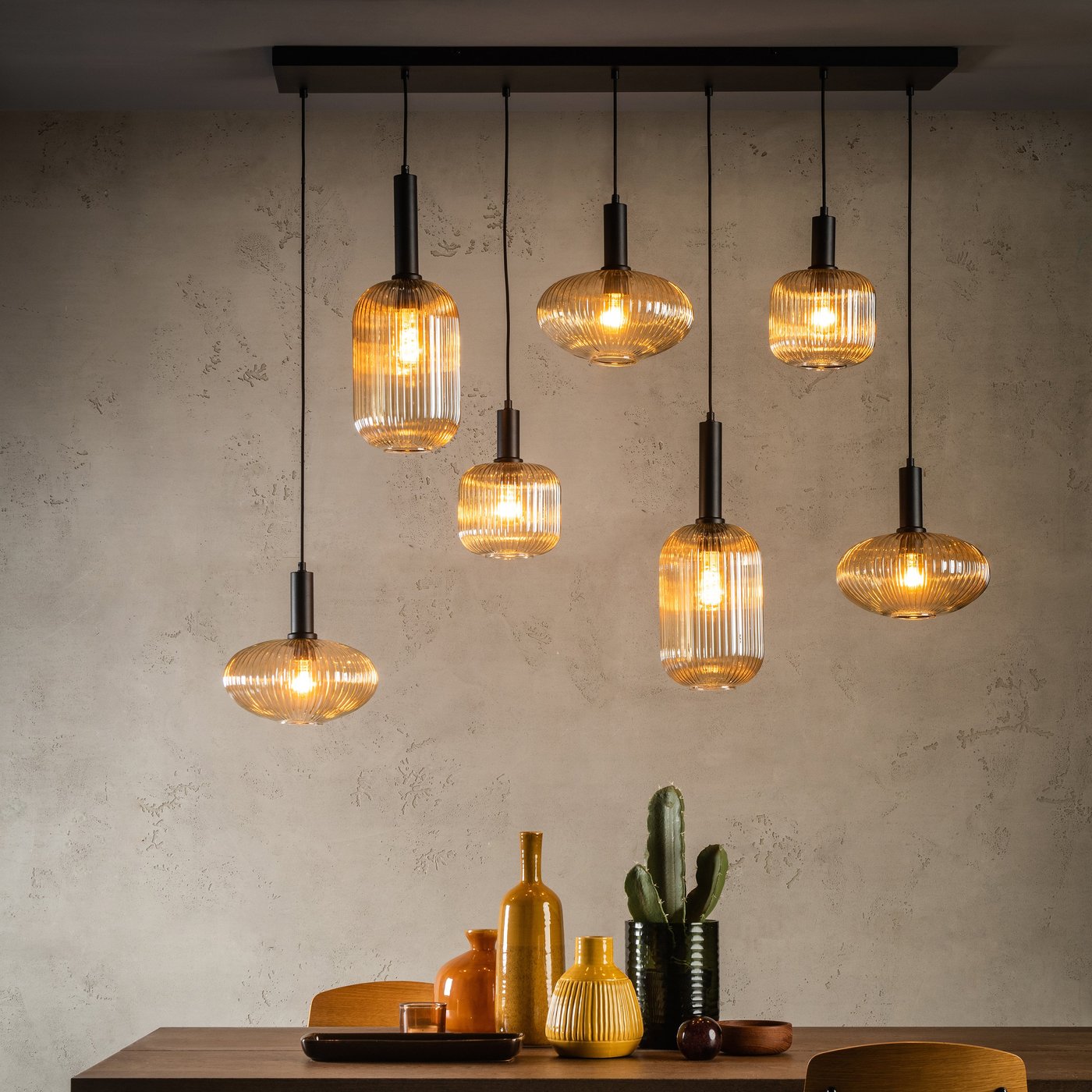 Эффектная и стильная люстра над обеденным столом? Такая, о которой ваши гости будут говорить днями? Maloto точно знает, как это сделать. Шесть подвесных светильников крепятся к металлической пластине размером 130 на 30 сантиметров. Стеклянные абажуры, вдохновлённые ретро-дизайном, представлены в трёх разных формах, создавая игривую элегантность. Высота каждого светильника регулируется, что позволяет оптимально подобрать его размер под пространство. Люстру также можно подключить к диммеру. Для идеального настроения во время уютных ужинов.