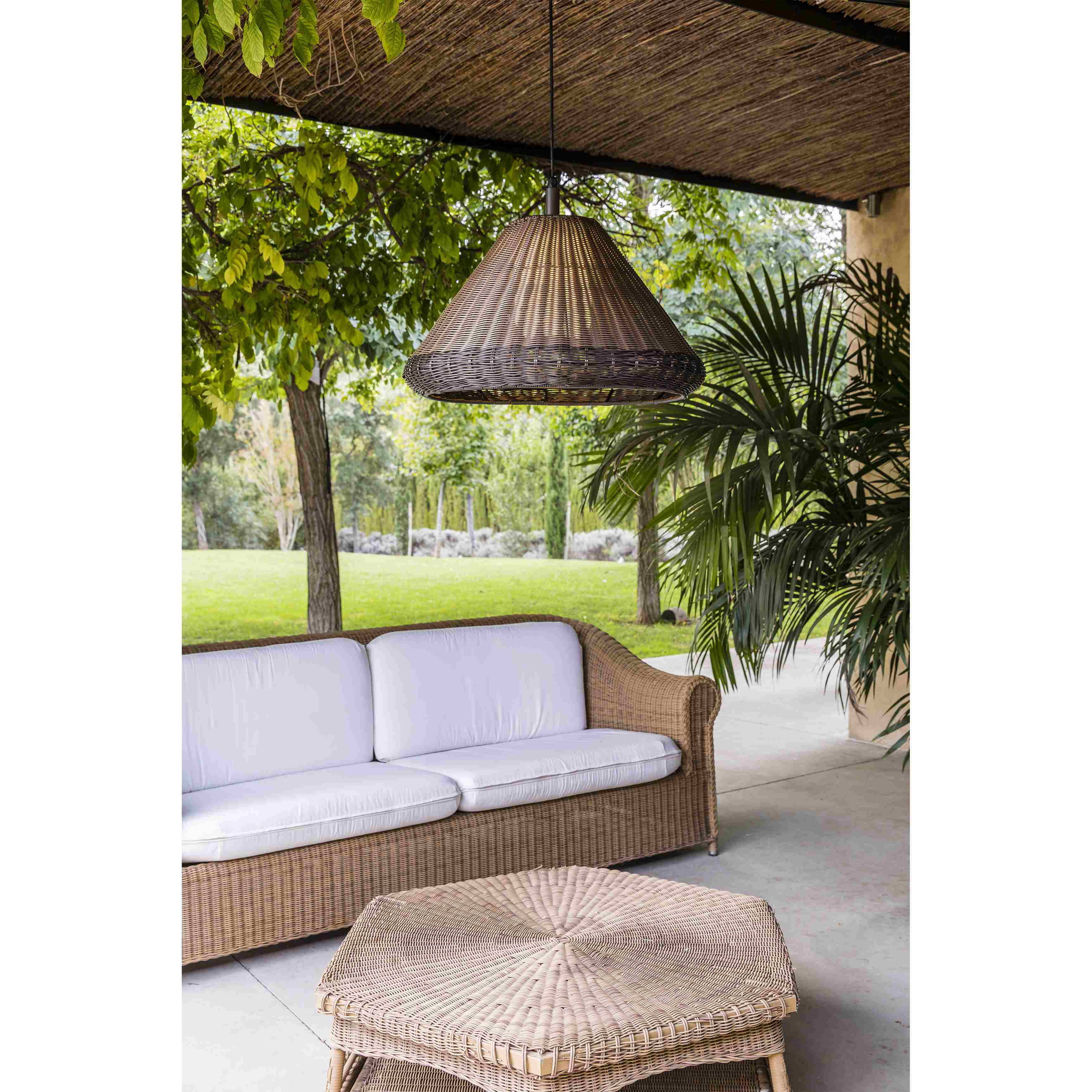 Подвесной светильник из коллекции SAIGON OUT от Faro Barcelona имеет стильный конусный абажур коричневого цвета, выполненный из синтетической лозы. Этот светильник оснащён патроном E27 для ламп мощностью до 15 Вт, включая энергоэффективные LED-лампы. Светильник создаёт мягкое, рассеянное освещение, подходящее для наружных пространств, таких как террасы или веранды. Алюминиевый корпус и ПЭМД рассеиватель обеспечивают долговечность и защиту от внешних воздействий. Длина кабеля 1,2 м даёт гибкость в размещении светильника, а степень защиты IP44 защищает от влаги и пыли. Элегантный и современный дизайн добавляет светильнику универсальности, позволяя ему органично вписываться в различные ландшафтные и архитектурные решения.