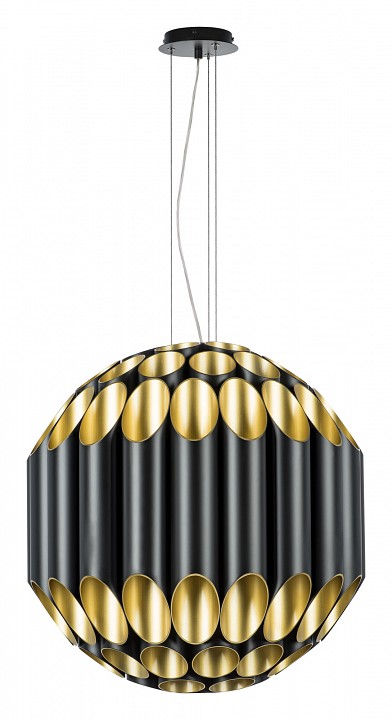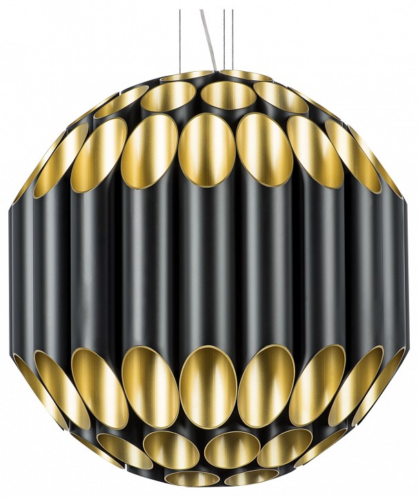 Подвесной светильник предназначен для потолочного монтажа в жилых помещениях, включая гостиную, кабинет и спальню. Он состоит из сорока цилиндрических плафонов из металла с глянцевой и матовой поверхностью, подвешенных на металлическом каркасе с возможностью регулировки высоты и креплением на монтажной пластине. Арматура выполнена из матового металла, цвет плафонов и подвесов сочетает золотой и чёрный. Светильник рассчитан на 80 ламп с цоколем G9, тип ламп — галогеновые или светодиодные, максимальная мощность каждой 40 Вт, питание 220 В, диапазон рабочих температур +1 до +35 °C, степень защиты IP20. Направление света комбинированное — вверх и вниз, диаметр 600 мм, минимальная высота подвеса 670 мм, масса изделия 23,8 кг.