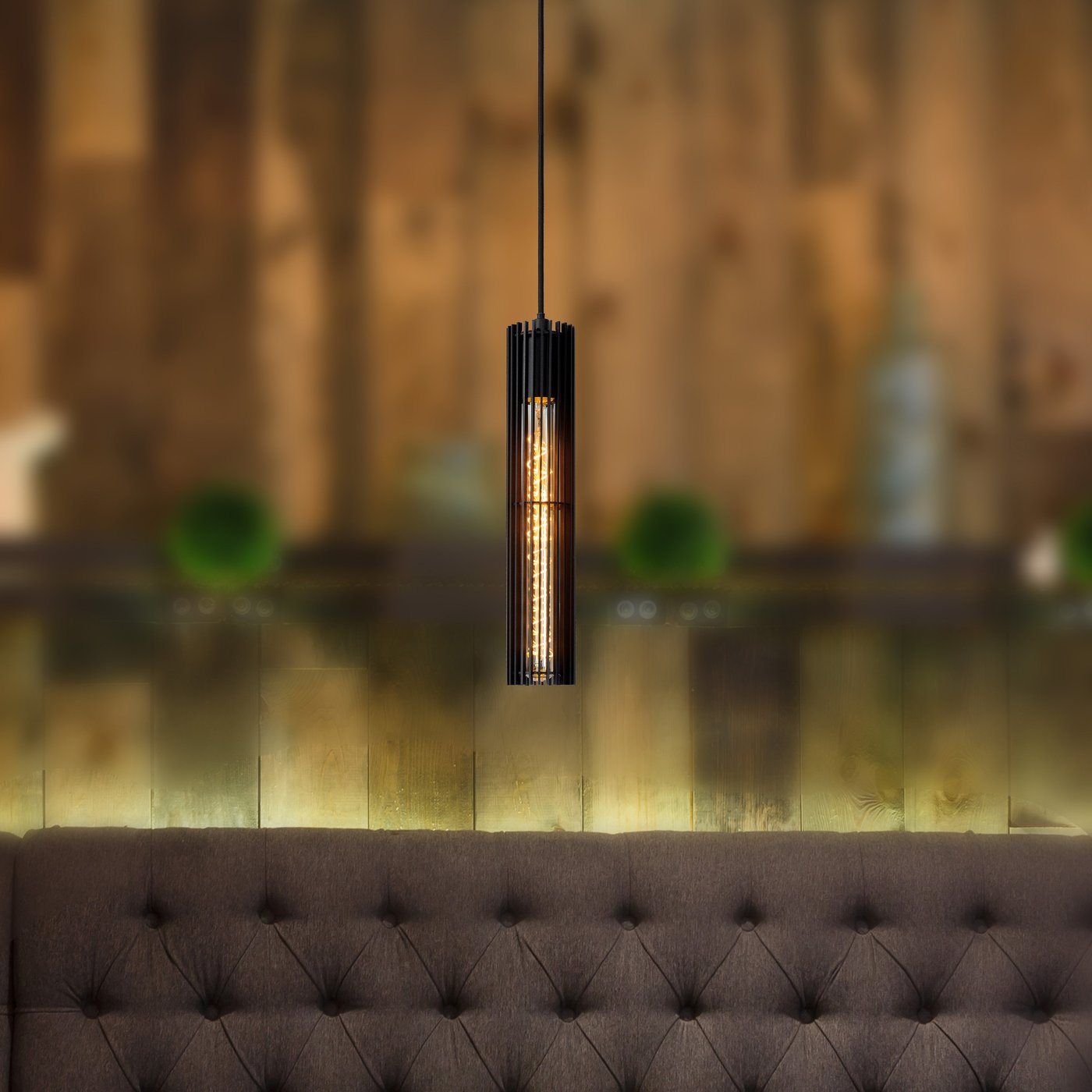 Подвесной светильник с узким цилиндрическим плафоном из металлических планок предназначен для локального освещения и подвешивается на регулируемом кабеле. Конструкция формирует открытый абажур диаметром 6,5 см и высотой 34 см, внутри которого устанавливается лампа с цоколем E27 мощностью до 60 Вт, при этом источник света не входит в комплект. Высота подвеса изменяется в диапазоне от 50 до 180 см, что позволяет адаптировать размещение по высоте потолка. Металлический корпус и потолочная чаша размером 11×11×2,5 см выполнены в одном стиле, степень защиты IP20 рассчитана на использование в помещениях.