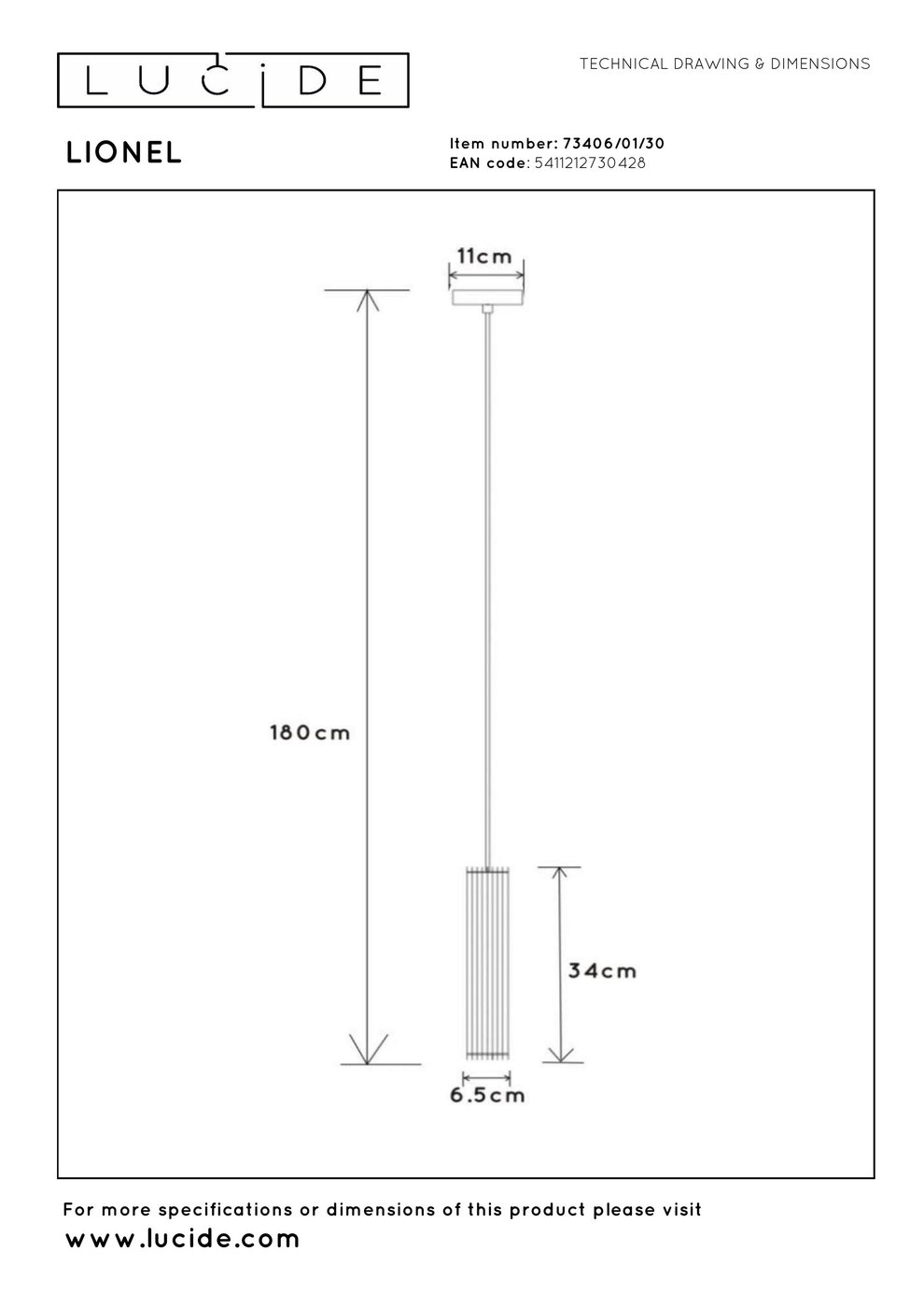 73406/01/30 Lucide Lionel подвесной светильник с цилиндрическим металлическим плафоном