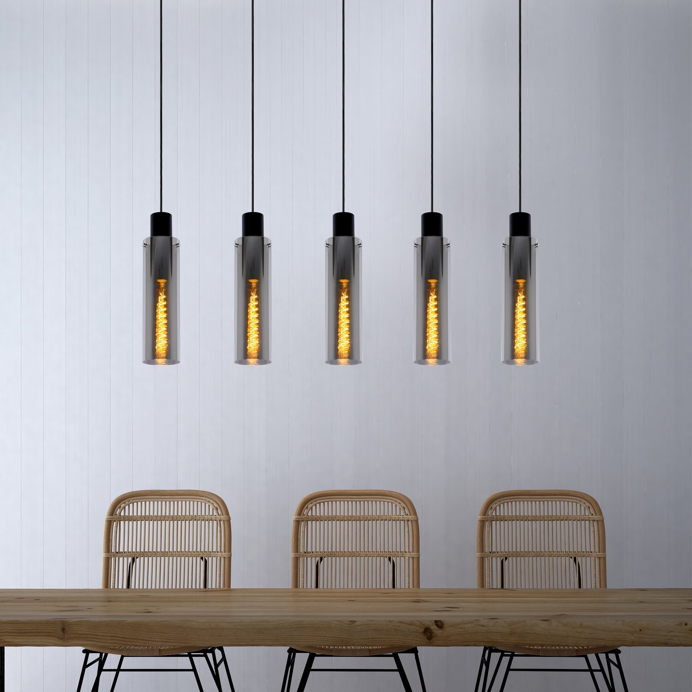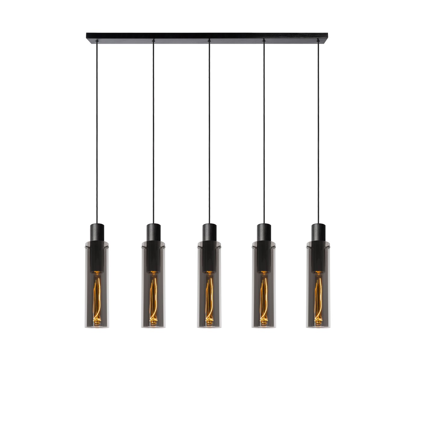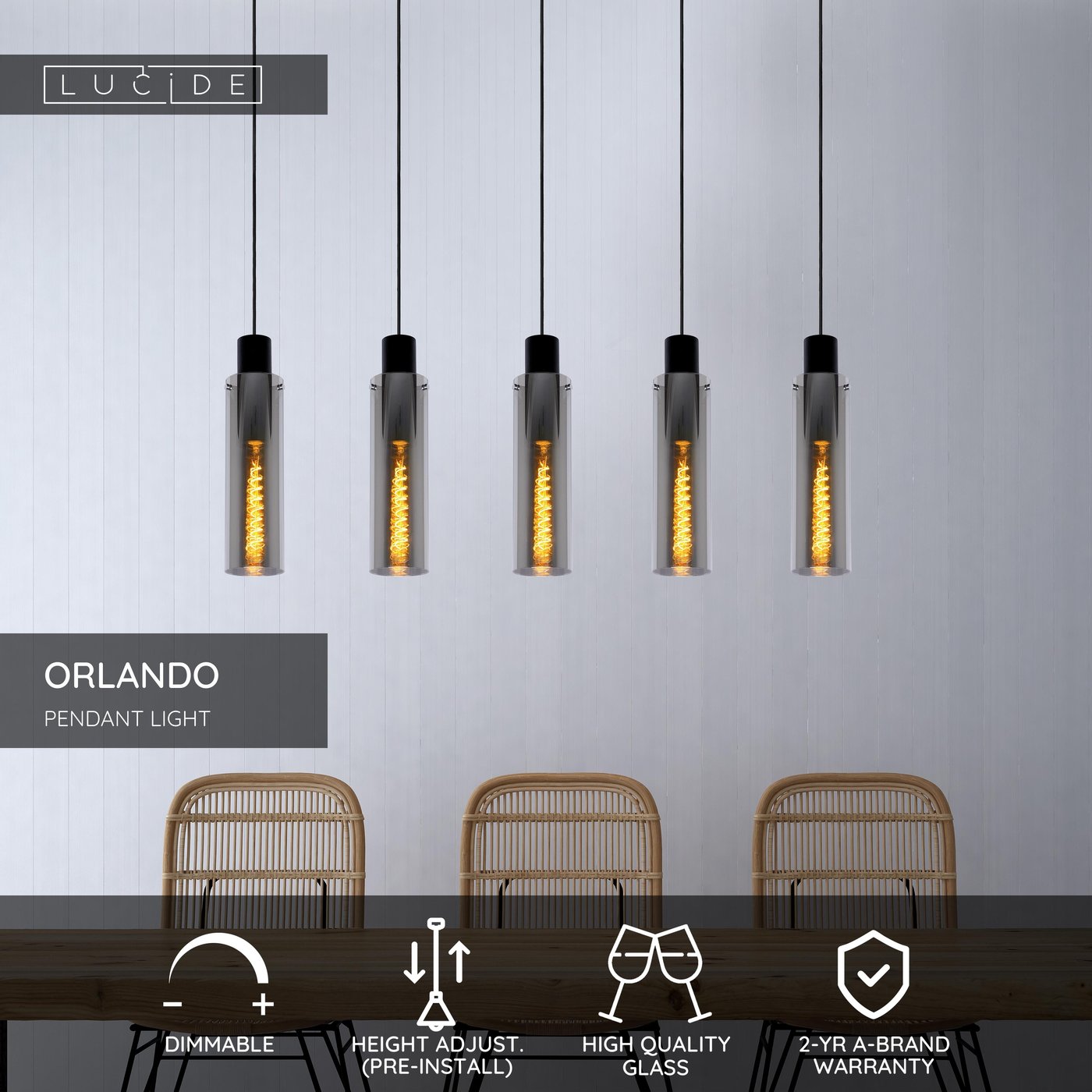 Пять источников света — это в пять раз больше настроения и стиля. Эта версия подвесного светильника Orlando идеально подходит для современной столовой. Чёрное дымчатое стекло придаёт помещению таинственный и уютный оттенок. Особенно в сочетании с трубчатой лампой накаливания, также из дымчатого стекла. Вы можете добиться оптимального освещения Orlando, повесив его на нужной высоте в комнате. Вы можете отрегулировать высоту освещения самостоятельно: от 120 до 172 сантиметров. Подключите светильник к диммеру и создайте нужную атмосферу для любого ужина.