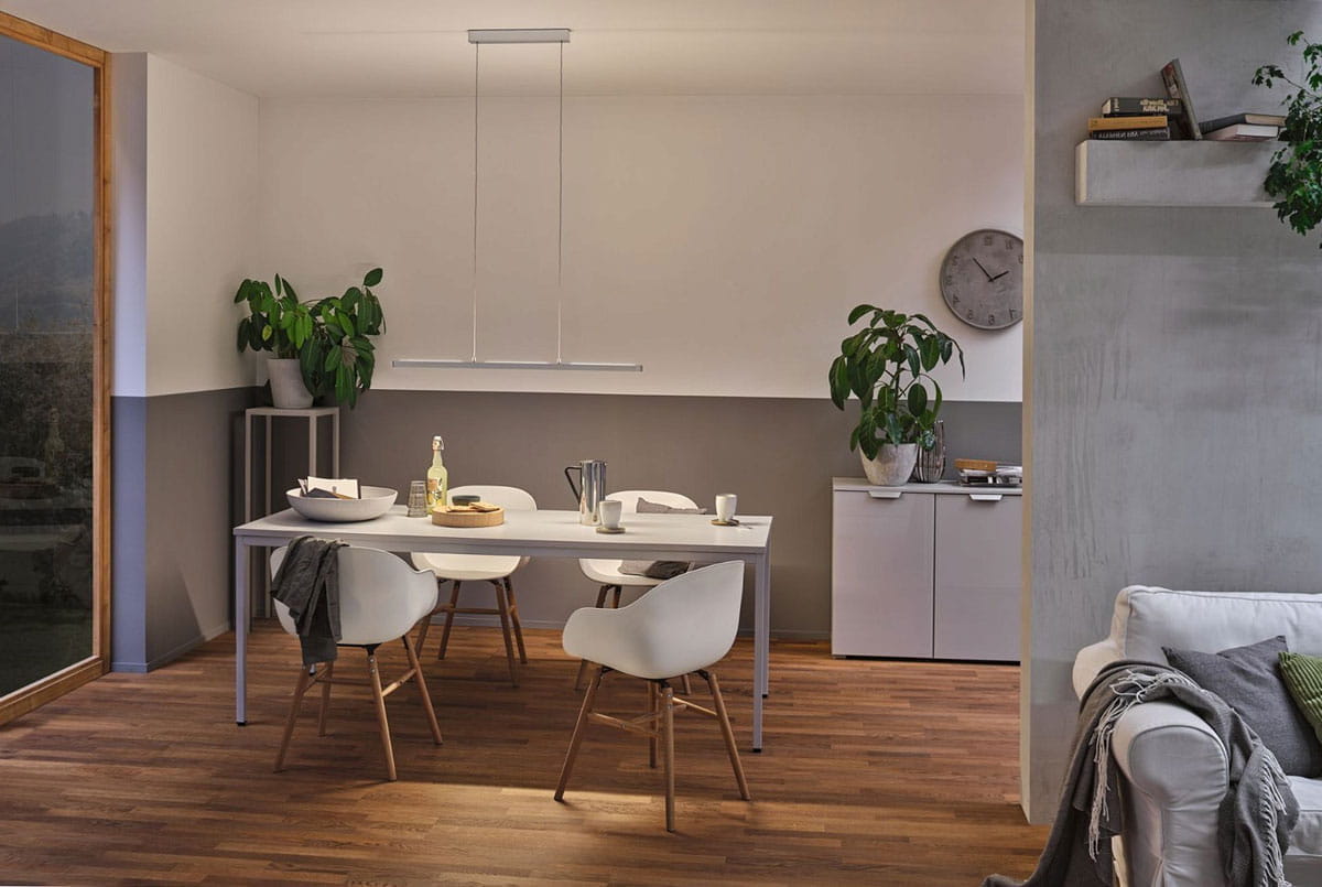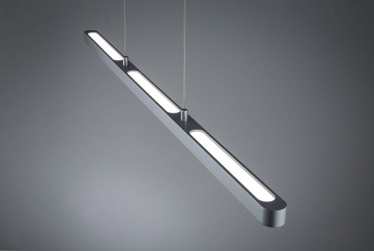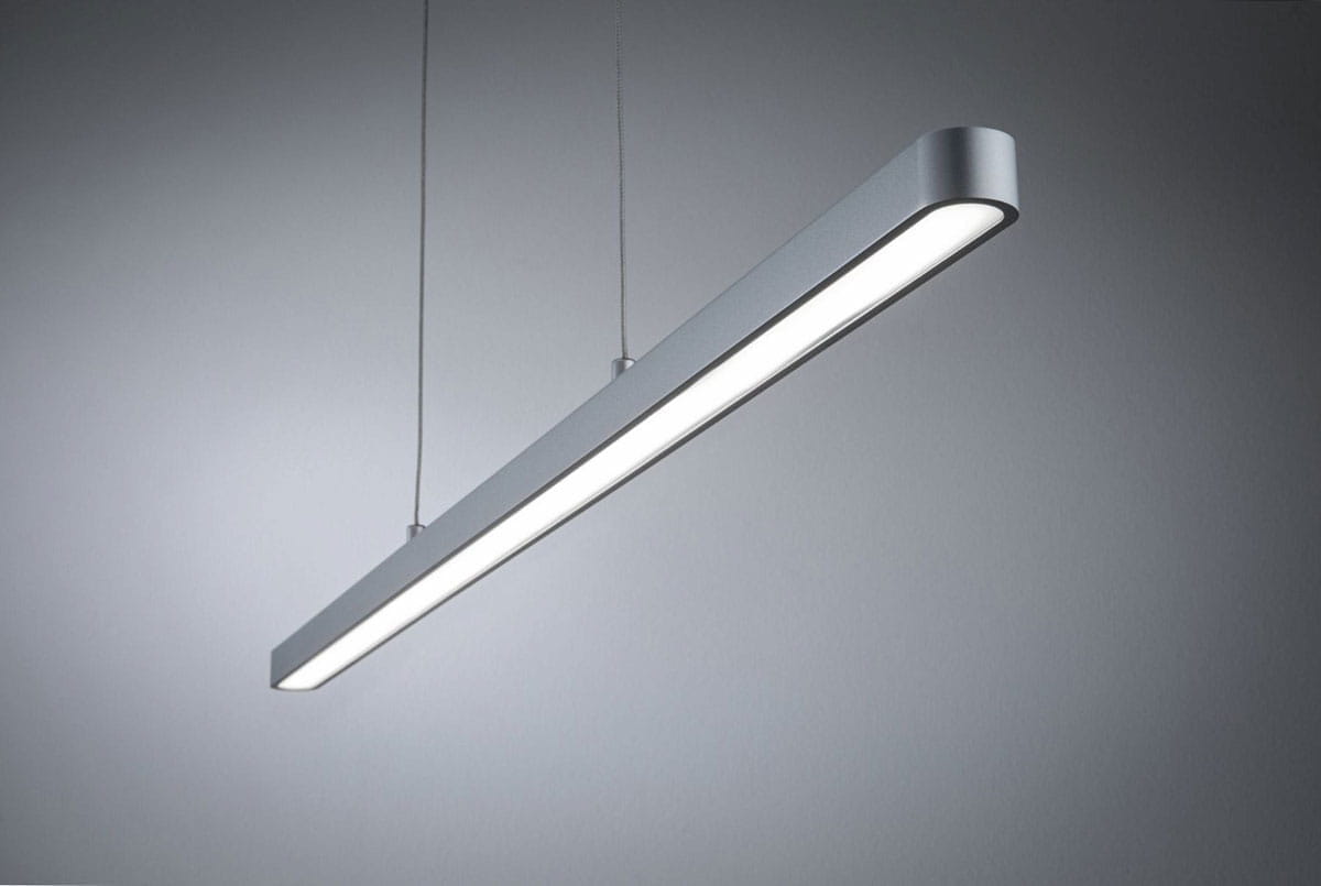Линейный, современный и технический: представляем регулируемый по высоте подвесной светильник Lento в матовом хроме. Он убедит вас своим высоким световым потоком и излучает свет как вверх, так и вниз. Яркость и белый тон можно настроить по мере необходимости с помощью приложения Paulmann Bluetooth.