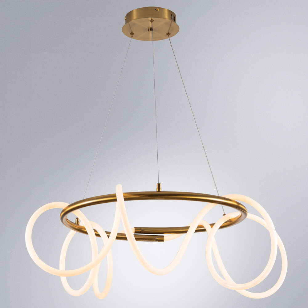 Подвесная люстра Arte Lamp Klimt выполнена в современном стиле и отличается выразительной пластичной композицией с динамичной формой. Конструкция диаметром 700 мм и высотой 400 мм объединяет металлическую арматуру с глянцевой поверхностью из полированной меди и светящиеся элементы из матового белого акрила, образующие свободные плавные линии. Светильник формирует многовекторный световой поток, направленный в стороны, вниз и вверх, создавая насыщенное и равномерное освещение пространства. Встроенный светодиодный источник мощностью 46 Вт обеспечивает световой поток 8320 лм с тёплой цветовой температурой 3000 К. Модель рассчитана на освещение площади до 37,5 м² и подходит для гостиной, кабинета или прихожей современного интерьера. Люстра предназначена для потолочного монтажа на монтажной пластине, поддерживает возможность диммирования и выступает как функциональный и декоративный центр композиции.