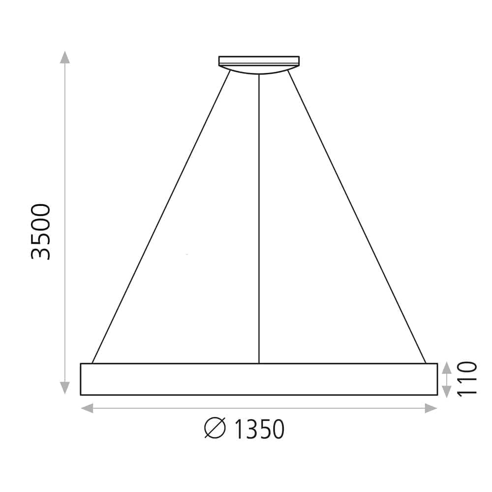 Подвесной светильник кольцевой формы предназначен для общего освещения помещений и размещается на потолке с помощью трёх тросов и центрального кабеля. Конструкция представляет собой широкое кольцо диаметром 1350 мм с внутренним светорассеивателем, формирующим направленный вниз световой поток. Высота подвеса по схеме составляет около 3500 мм, толщина корпуса — 110 мм. Встроенный светодиодный источник мощностью 168 Вт обеспечивает световой поток 13100 лм с цветовой температурой 3000K, предусмотрено диммирование по протоколу Triac. Модель относится к серии Dilga производителя ACB Iluminacion и рассчитана на использование в интерьерах, где требуется равномерное освещение большой площади.