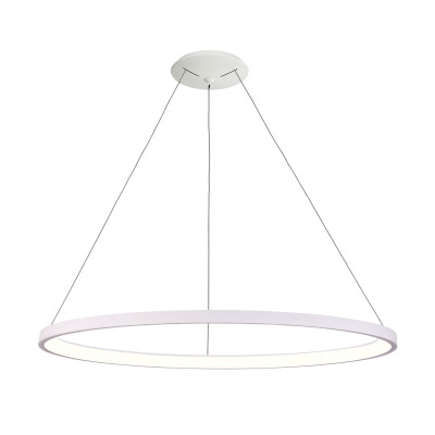 Подвесная люстра воспринимается как аккуратное кольцо на тонких тросах, создающее плавный визуальный акцент над обеденным столом или рабочей зоной. Включение LED-модуля сразу формирует равномерный световой поток, мягко освещая поверхность, а движение руки под подвесом позволяет заметить, как свет распределяется без резких теней и бликов. Диаметр 980 мм и минимальная толщина 35 мм делают люстру лёгкой в восприятии, при этом регулируемая длина подвеса до 2 метров позволяет адаптировать свет под конкретную высоту помещения. Белая матовая отделка подчёркивает строгость формы и создаёт нейтральный фон, который усиливает контраст с ярким светом и удерживает внимание на функциональной зоне. Светильник работает как точный инструмент распределения света, одновременно формируя декоративный центр композиции и ритм интерьера, задавая визуальную структуру пространству.