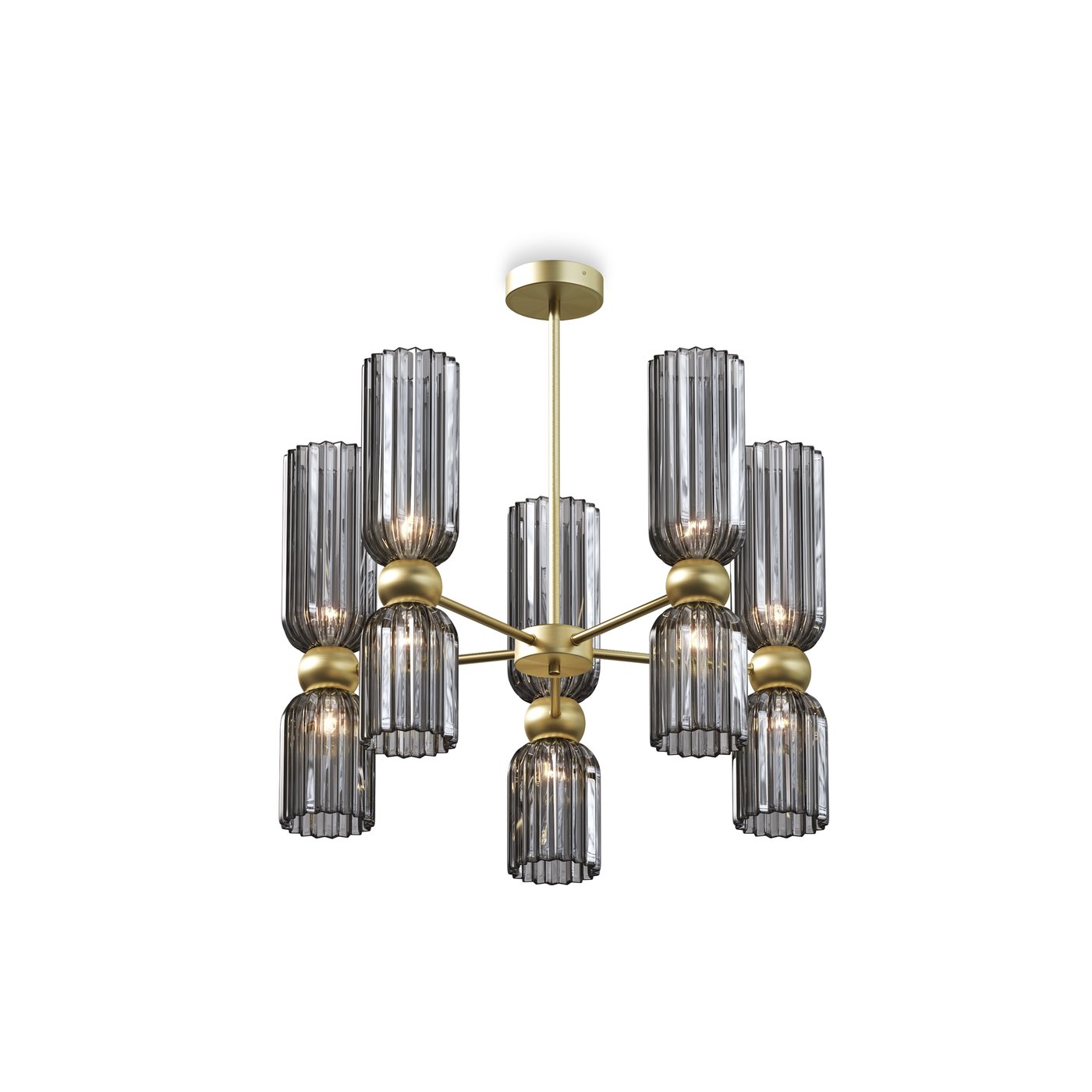 подвесная люстра с шестью плафонами из серого стекла в золотом корпусе