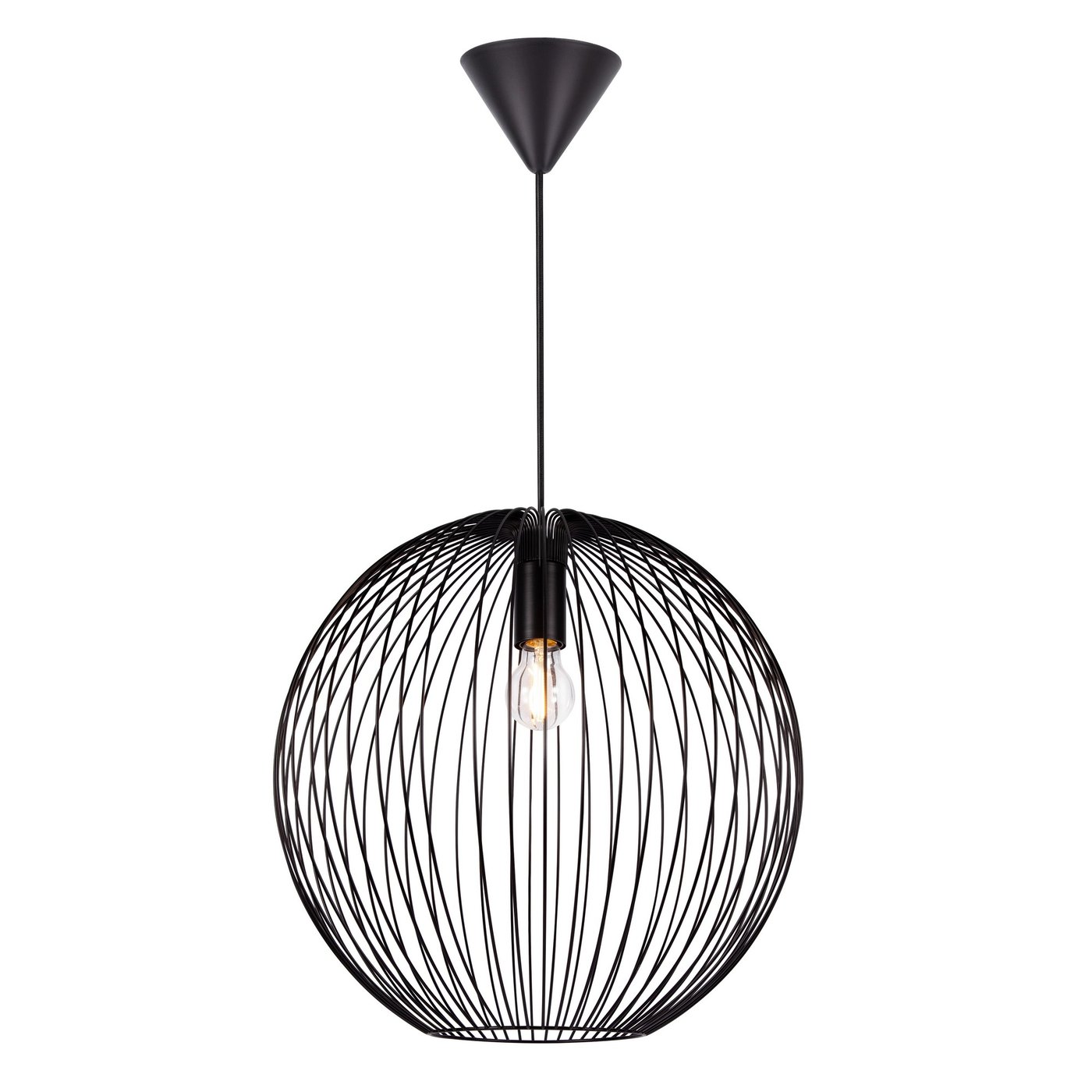 Подвесной светильник с открытым металлическим каркасом в форме сферы создаёт выразительную графику и оставляет источник света полностью видимым. В серии Nordlux Beroni тонкие чёрные прутья диаметром 45 см формируют объёмную решётку, через которую свет свободно распространяется в стороны и вниз, создавая живую игру теней на стенах и потолке. Модель работает как основной свет над обеденным столом или в гостиной, где при включении декоративная лампа становится частью композиции, а при смене её формы и температуры меняется характер освещения. Цоколь E27 рассчитан на лампу мощностью до 60 Вт, что позволяет выбрать как яркий источник для активного освещения, так и более мягкий для вечернего сценария; при использовании диммируемой лампы можно регулировать интенсивность. Кабель длиной 2 метра даёт возможность точно настроить высоту подвеса относительно стола. Степень защиты IP20 и класс II предназначены для эксплуатации в сухих жилых помещениях.