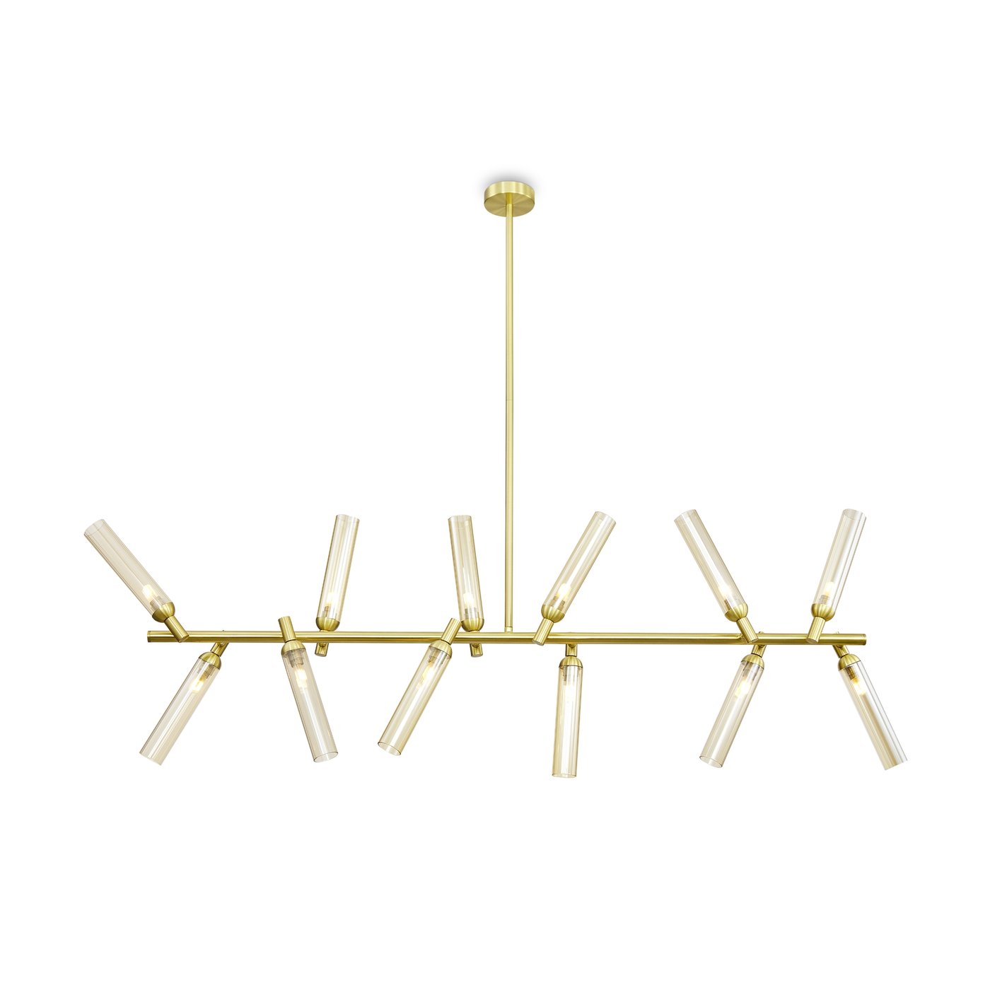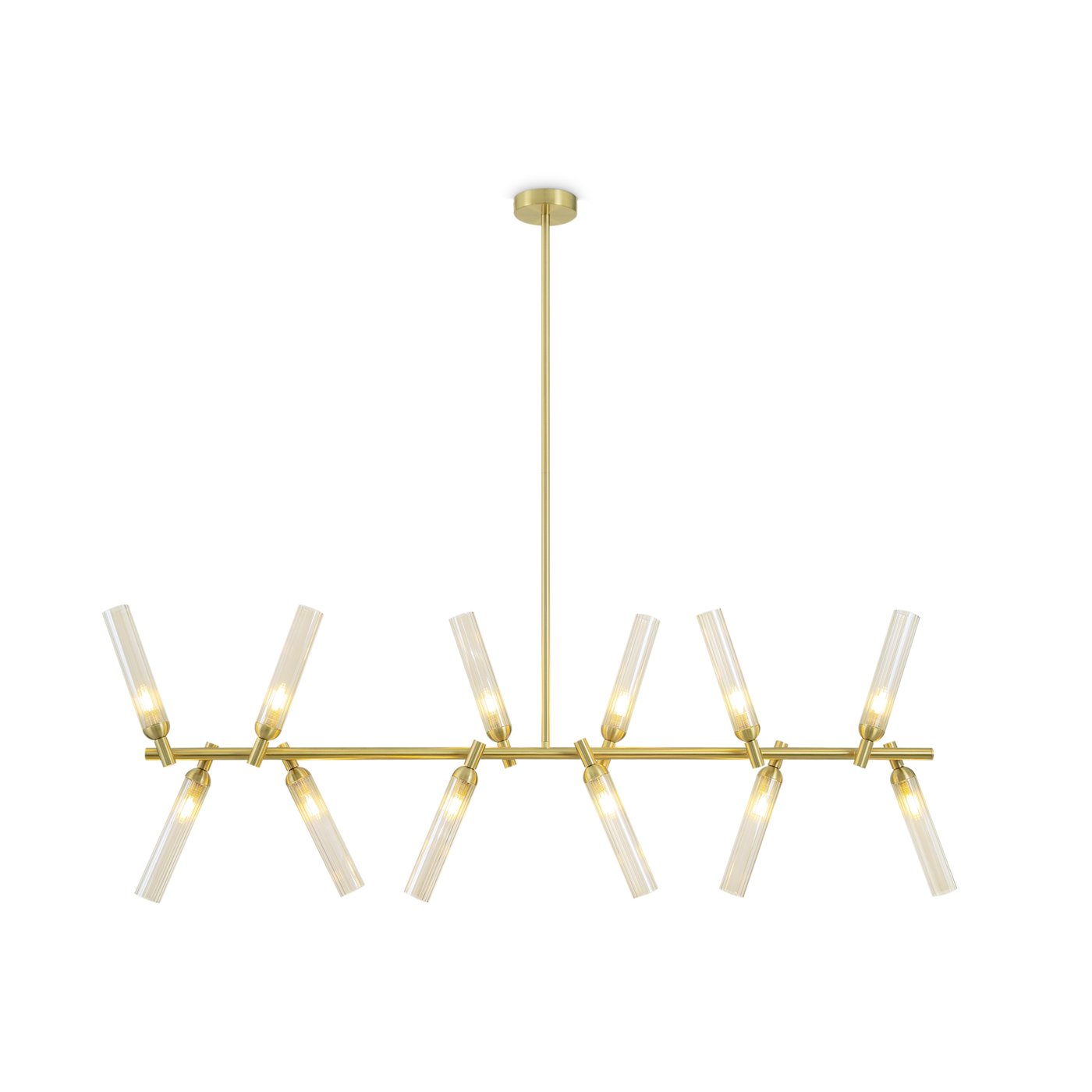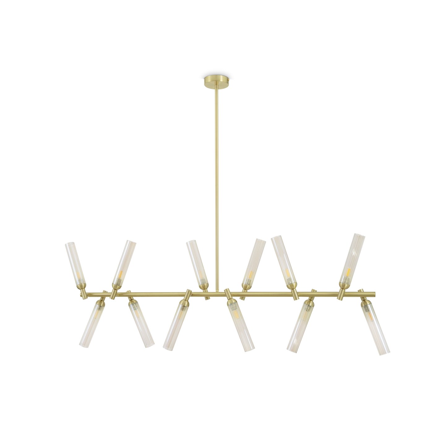 Подвесной светильник собран как вытянутая горизонтальная композиция на тонкой штанге, где двенадцать рельефных стеклянных плафонов расходятся под разными углами и работают как отдельные световые точки. В модели Freya из коллекции Borgy плафоны закреплены на металлических узлах, поэтому свет распределяется не одним пятном, а «рассыпается» по комнате и хорошо читается в пространстве. Такой подвес удобен над обеденным столом или кухонным островом: когда человек двигает рукой по поверхности, блики от янтарного стекла становятся мягче, а тени — менее резкими. За счёт трендовой фактуры ZIGZAG плафоны частично экранируют источник и уменьшают прямую слепимость, поэтому подвес можно использовать как основной свет в зоне общения. Конструкция рассчитана на 12 ламп с цоколем G9, что позволяет подобрать нужную цветовую температуру и яркость под задачу без привязки к встроенному LED. Регулировка высоты помогает точно опустить свет на рабочую плоскость, а крепление на планку и IP20 рассчитаны на сухие жилые помещения.