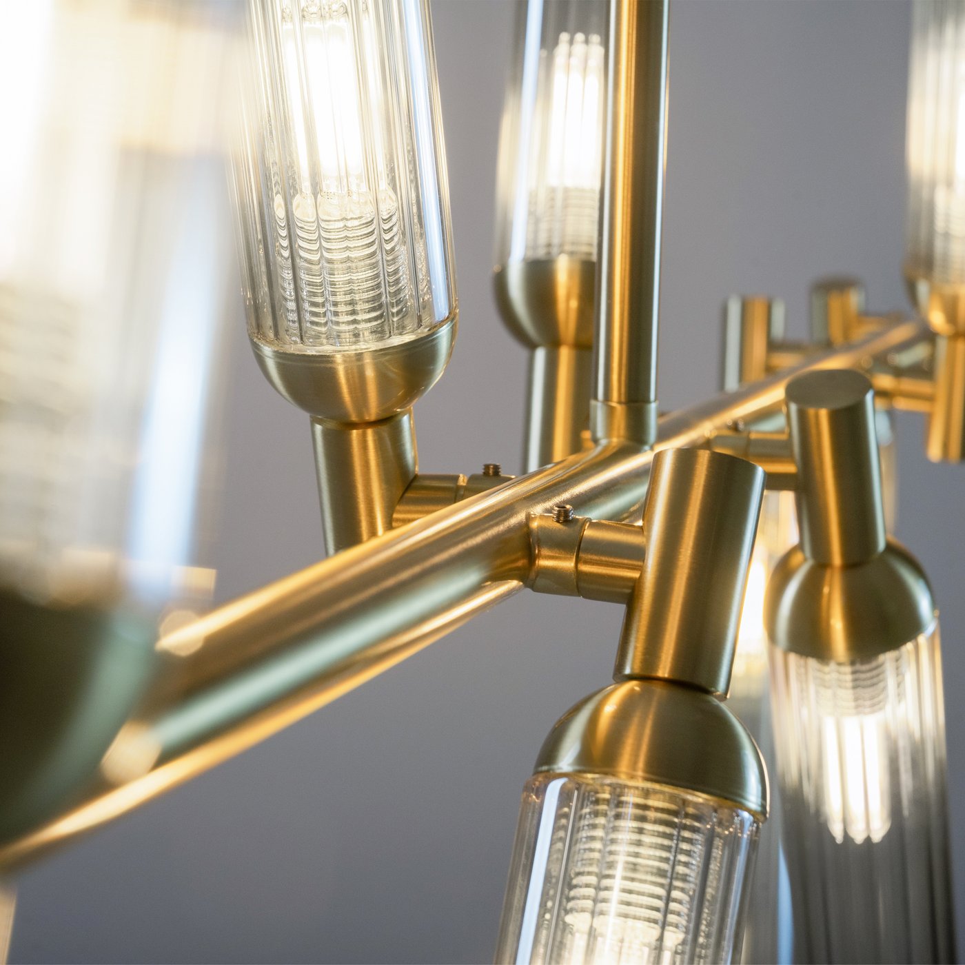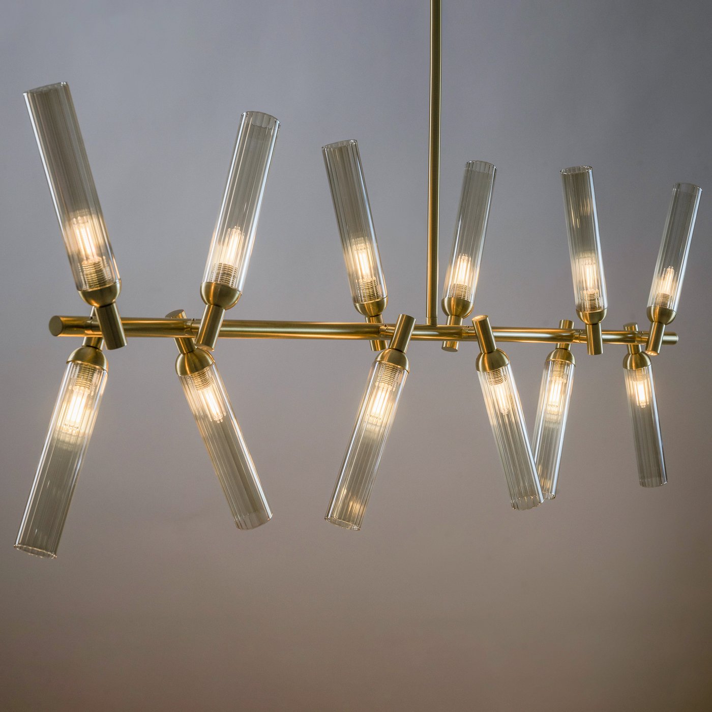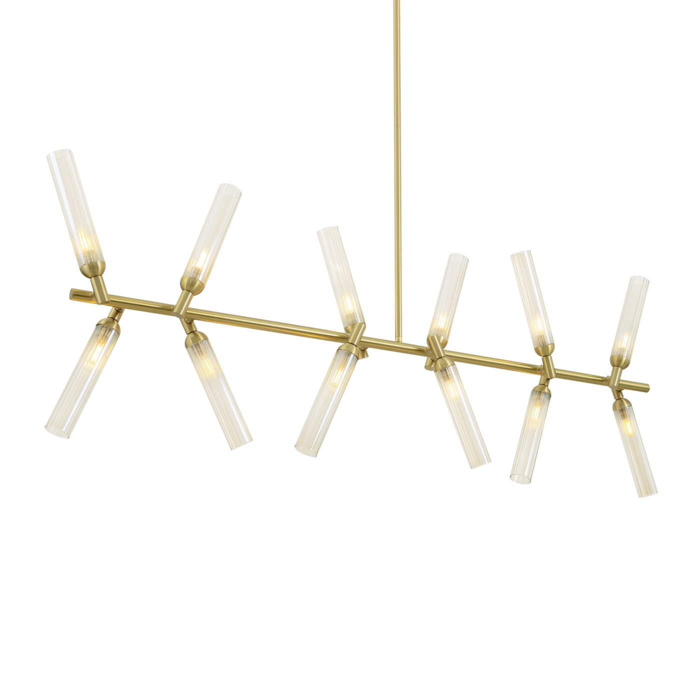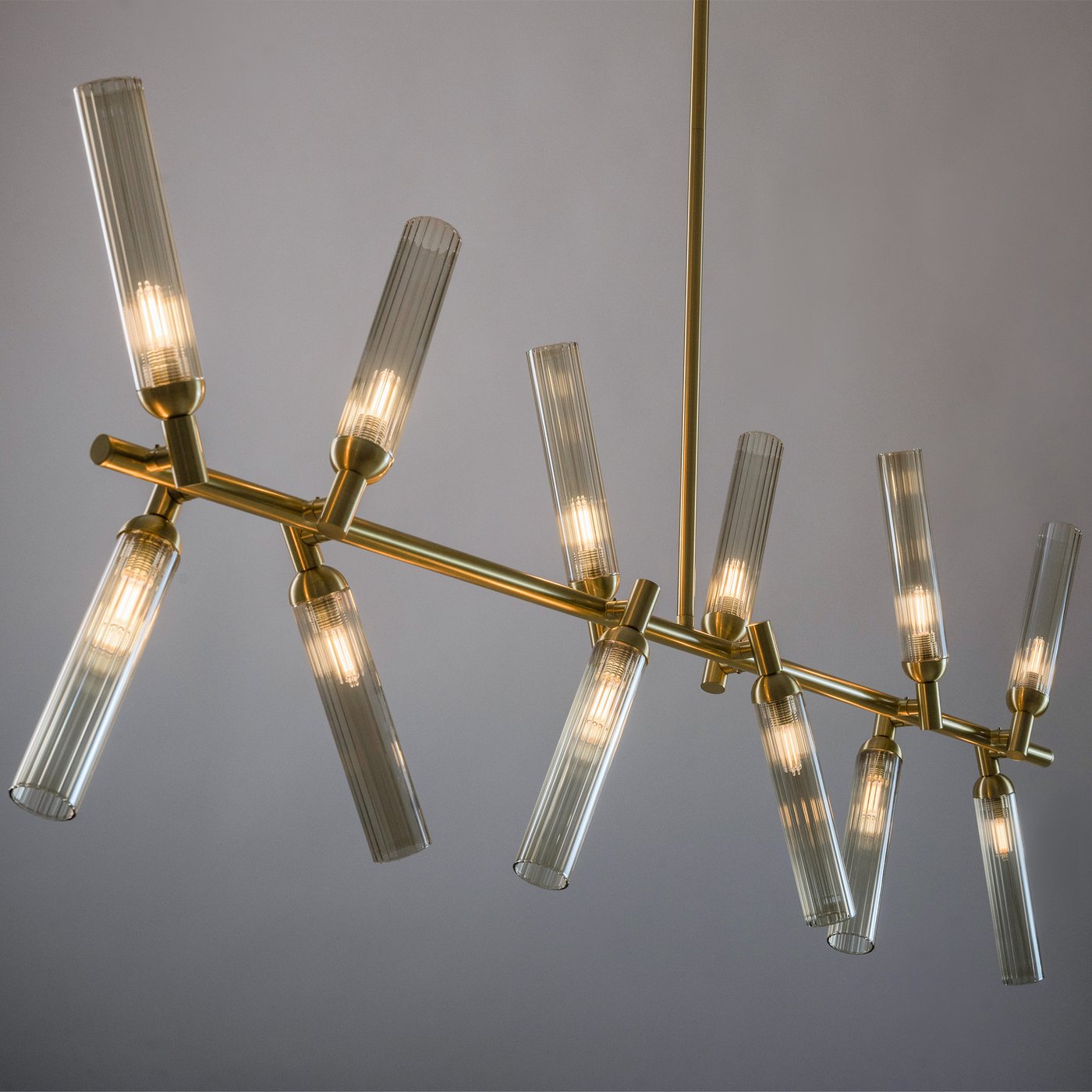 Подвесной светильник собран как вытянутая горизонтальная композиция на тонкой штанге, где двенадцать рельефных стеклянных плафонов расходятся под разными углами и работают как отдельные световые точки. В модели Freya из коллекции Borgy плафоны закреплены на металлических узлах, поэтому свет распределяется не одним пятном, а «рассыпается» по комнате и хорошо читается в пространстве. Такой подвес удобен над обеденным столом или кухонным островом: когда человек двигает рукой по поверхности, блики от янтарного стекла становятся мягче, а тени — менее резкими. За счёт трендовой фактуры ZIGZAG плафоны частично экранируют источник и уменьшают прямую слепимость, поэтому подвес можно использовать как основной свет в зоне общения. Конструкция рассчитана на 12 ламп с цоколем G9, что позволяет подобрать нужную цветовую температуру и яркость под задачу без привязки к встроенному LED. Регулировка высоты помогает точно опустить свет на рабочую плоскость, а крепление на планку и IP20 рассчитаны на сухие жилые помещения.