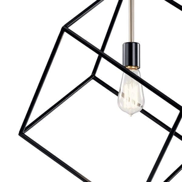 Подвесной светильник Cartone от Kichler из одноимённой коллекции представляет собой прибор с одной лампой, размещённой внутри асимметричной металлической конструкции в виде куба с открытой геометрией. Такой дизайн создаёт декоративный акцент, добавляет визуальный интерес и позволяет свету равномерно распространяться по комнате, подчёркивая современные интерьерные решения. Светильник рассчитан на лампу типа A19 с цоколем Medium, что позволяет выбрать источник света с нужной яркостью и цветовой температурой. Ширина 432 мм и масса 1,8 кг обеспечивают удобный монтаж на потолке, а общая высота 1499 мм с включёнными удлинителями 914 мм и длина кабеля 1753 мм позволяют адаптировать положение прибора под различную высоту потолков. Эксплуатация в сухих помещениях (Dry) делает светильник подходящим для кухни, столовой или гостиной. Отсутствие встроенной лампы даёт возможность регулировать интенсивность и характер освещения, создавая как основной, так и декоративный акцент в интерьере.