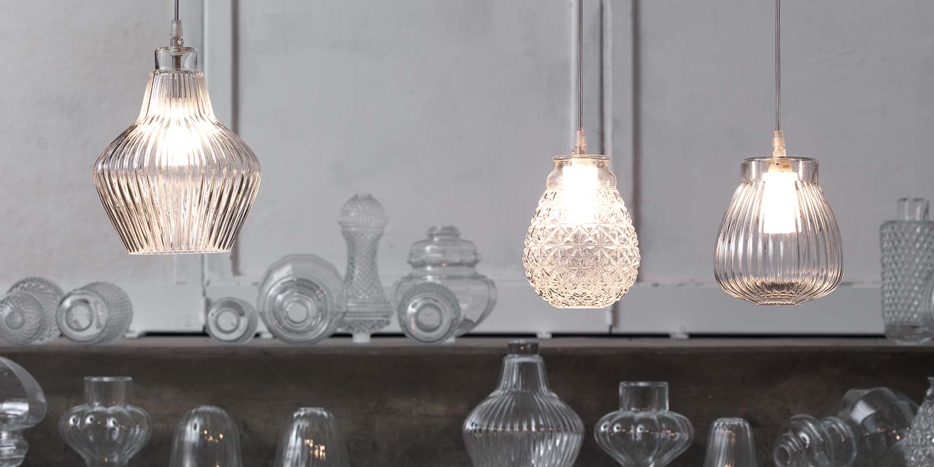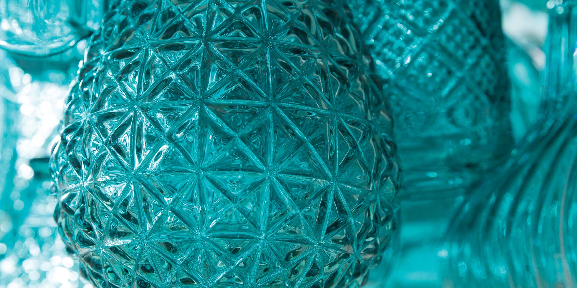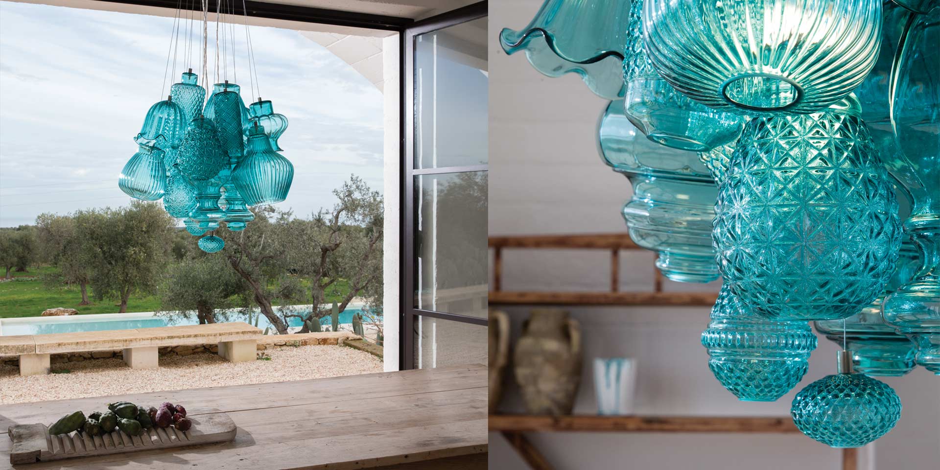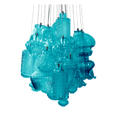 подвесная люстра с множеством голубых плафонов в форме кристаллов