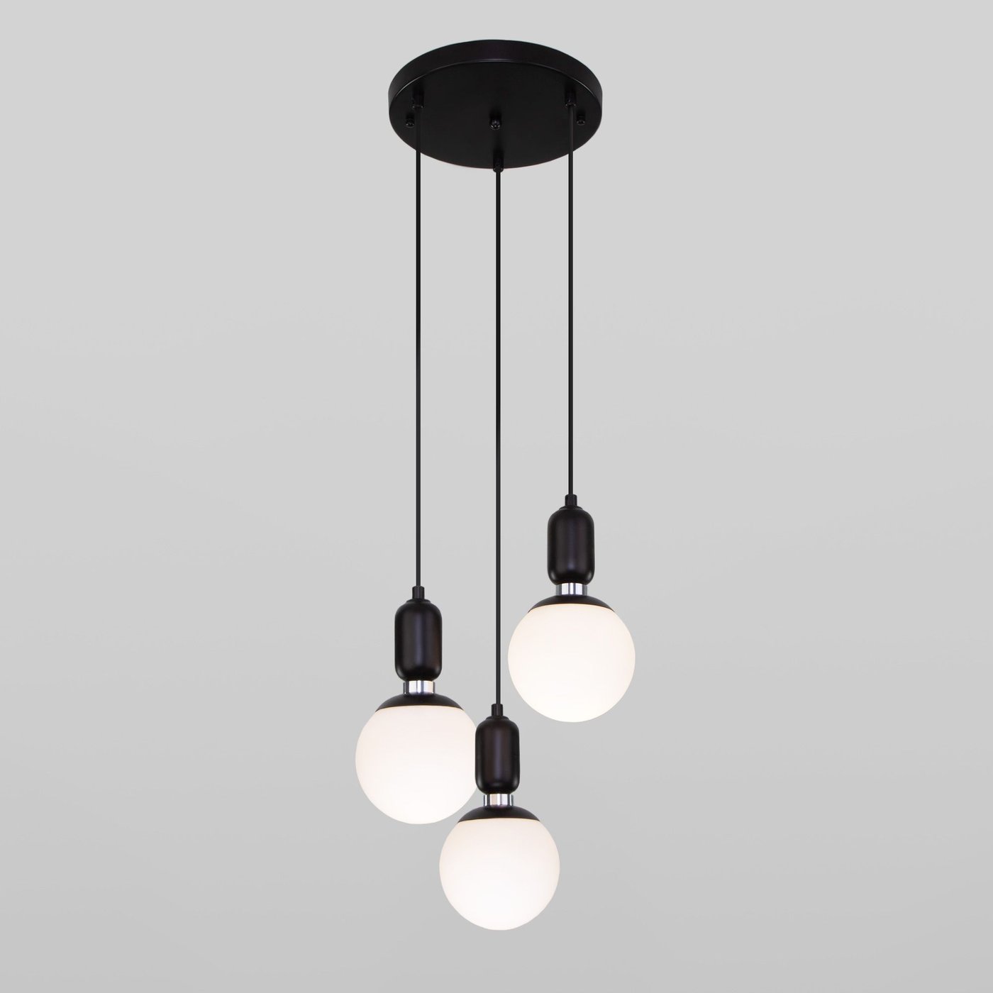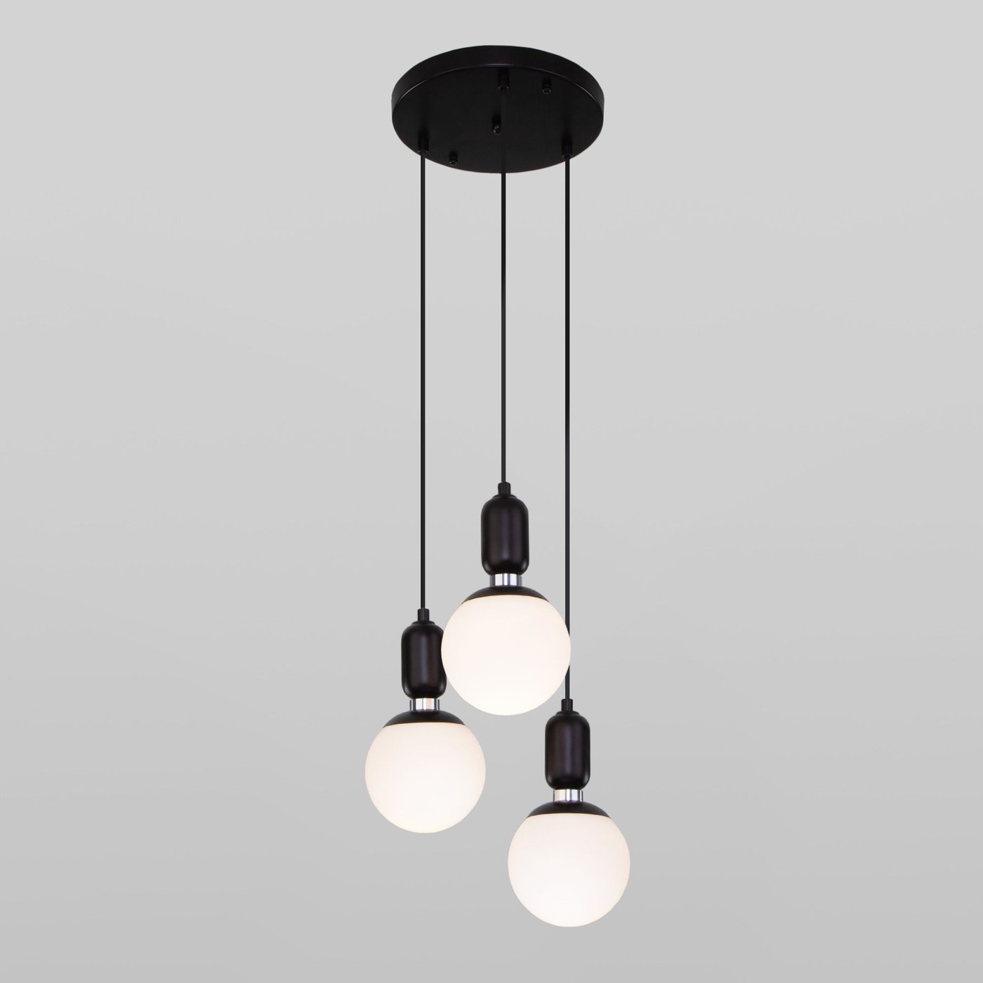 Подвесной светильник со стеклянными плафонами 50151/3 в черном цвете предназначен для создания дополнительного освещения и акцентной подсветки в современных интерьерах. Светильник со сменными лампами E27 создаст качественное освещение на площади 6 м кв. и подсветит рабочие зоны на кухне, в гостиной, в кабинете и в других местах.
