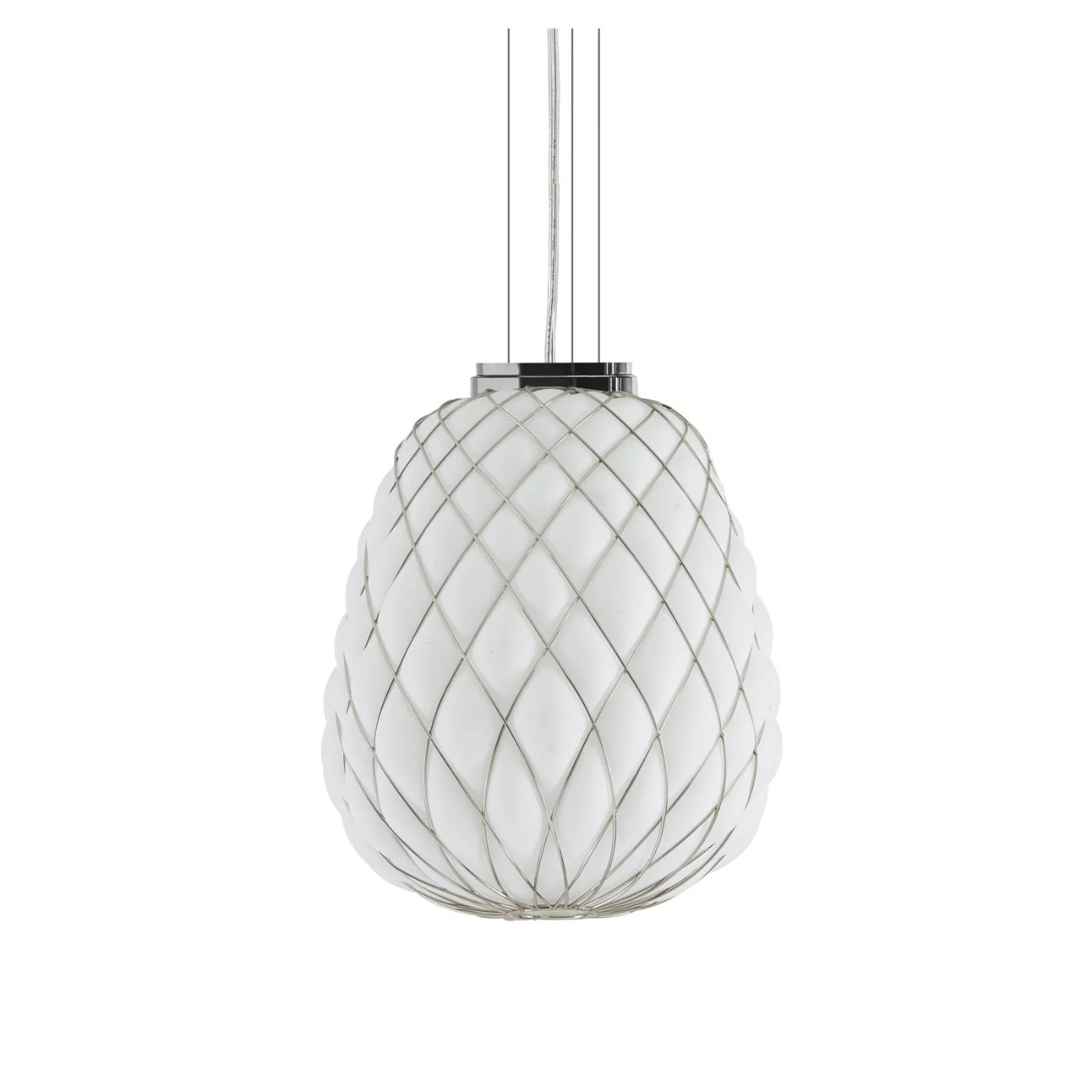 Подвесной светильник FontanaArte Pinecone Grande с рассеивателем из выдувного молочного стекла, хромированной или золотистой металлической корзиной и основанием. Белая потолочная розетка. Под лампу E27. Регулировка яркости с помощью фазового диммирования.