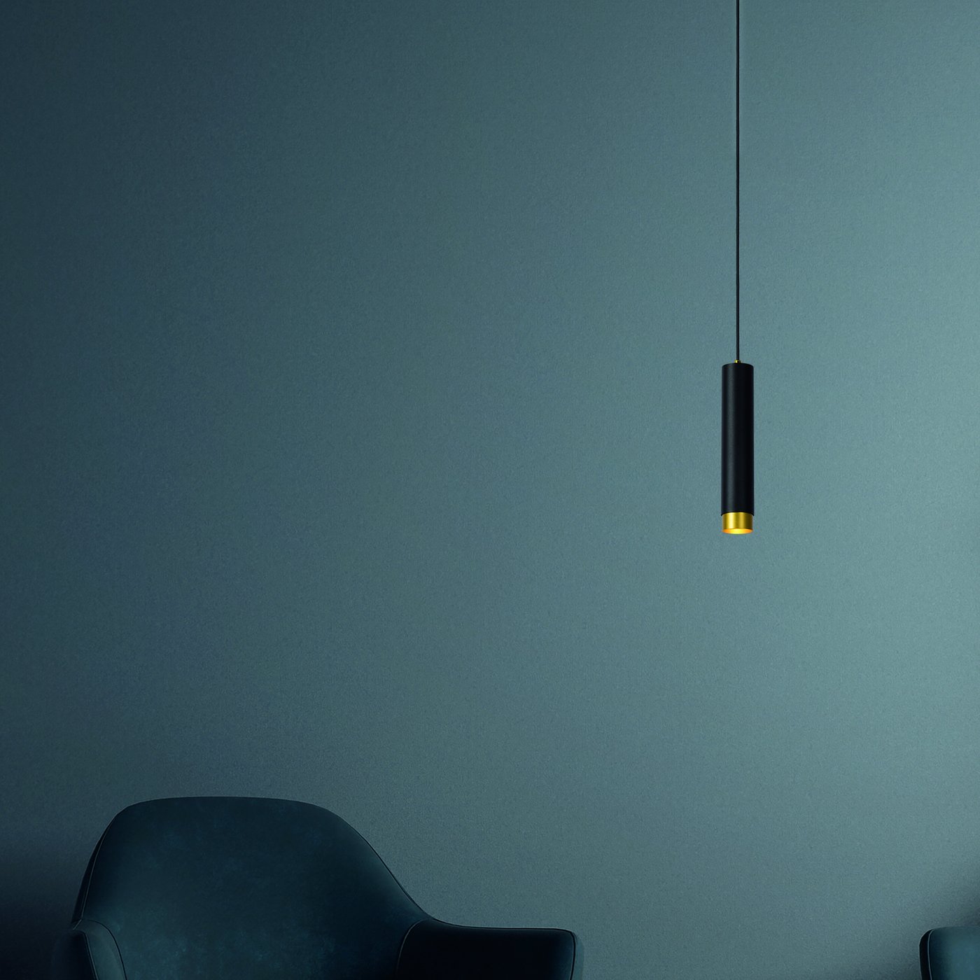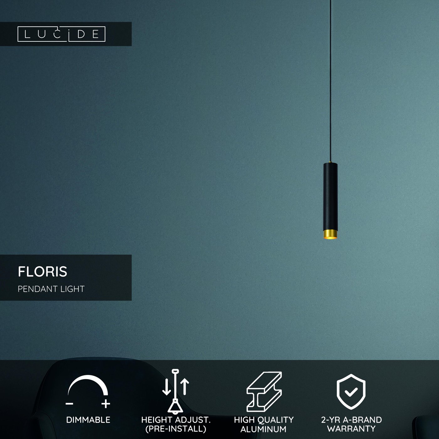 Подвесной светильник Floris от Lucide, артикул 35413/01/30, выполнен в виде узкого цилиндрического плафона, ориентированного на направленное освещение вниз. Корпус изготовлен из алюминия и закреплён на кабеле с потолочной чашей, при этом высота подвеса регулируется перед установкой в диапазоне до 182 см. Диаметр плафона составляет около 5,9 см при высоте около 30 см, что позволяет использовать светильник как одиночный акцент или в группе. Рассчитан на одну лампу с цоколем GU10 мощностью до 40 Вт, поддерживает диммирование. Питание осуществляется от сети 230 В, степень защиты IP20, установка предназначена для помещений.