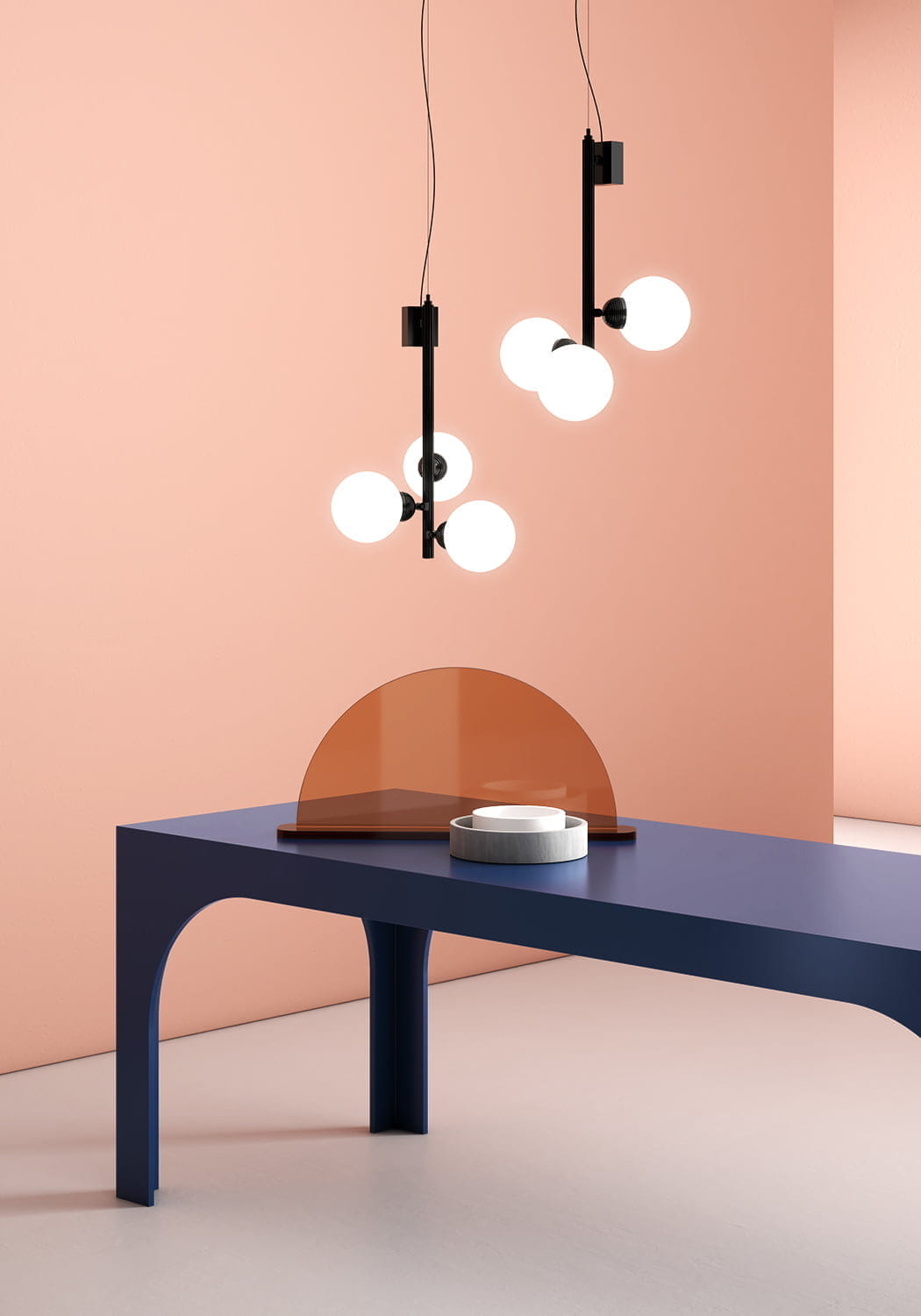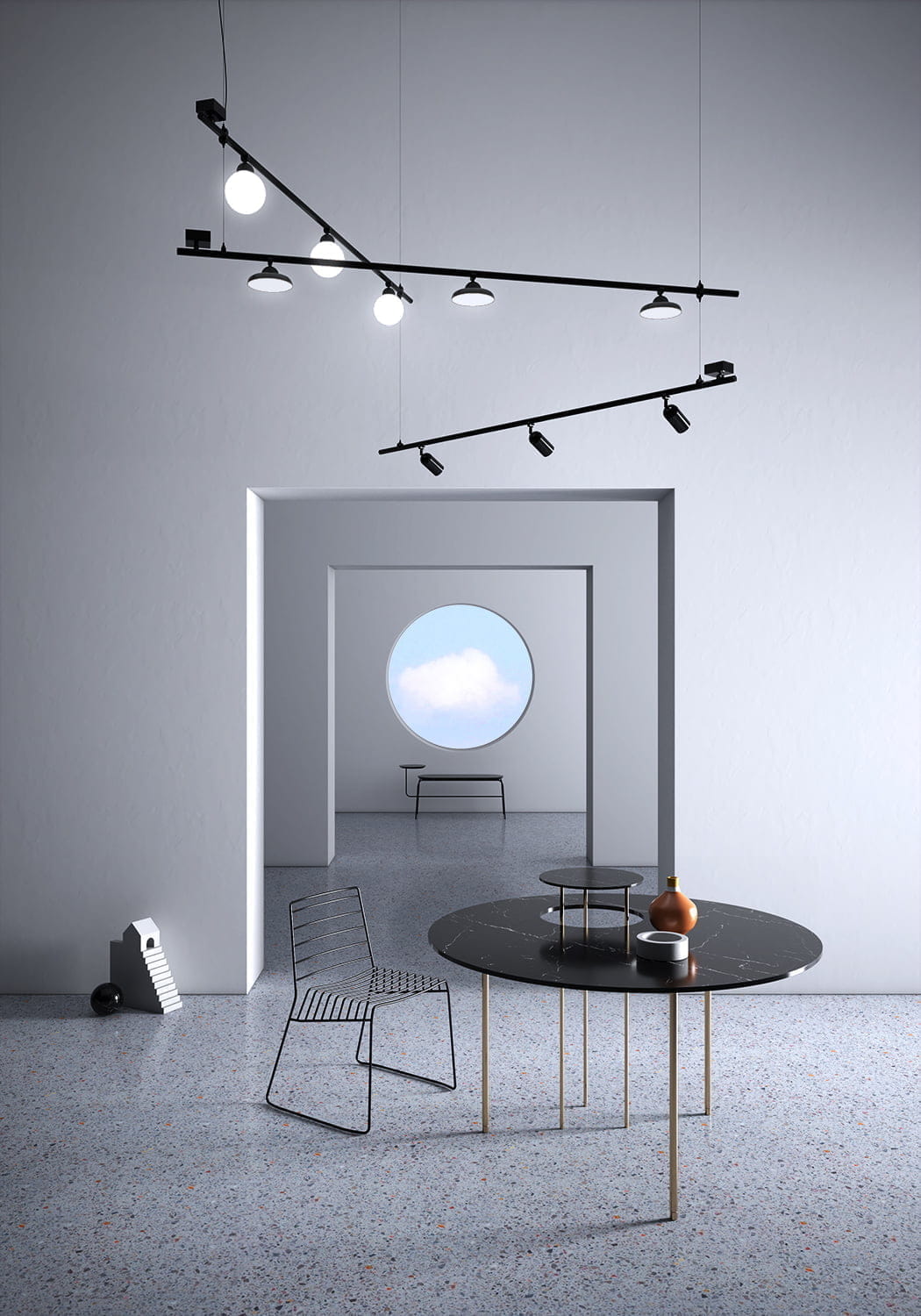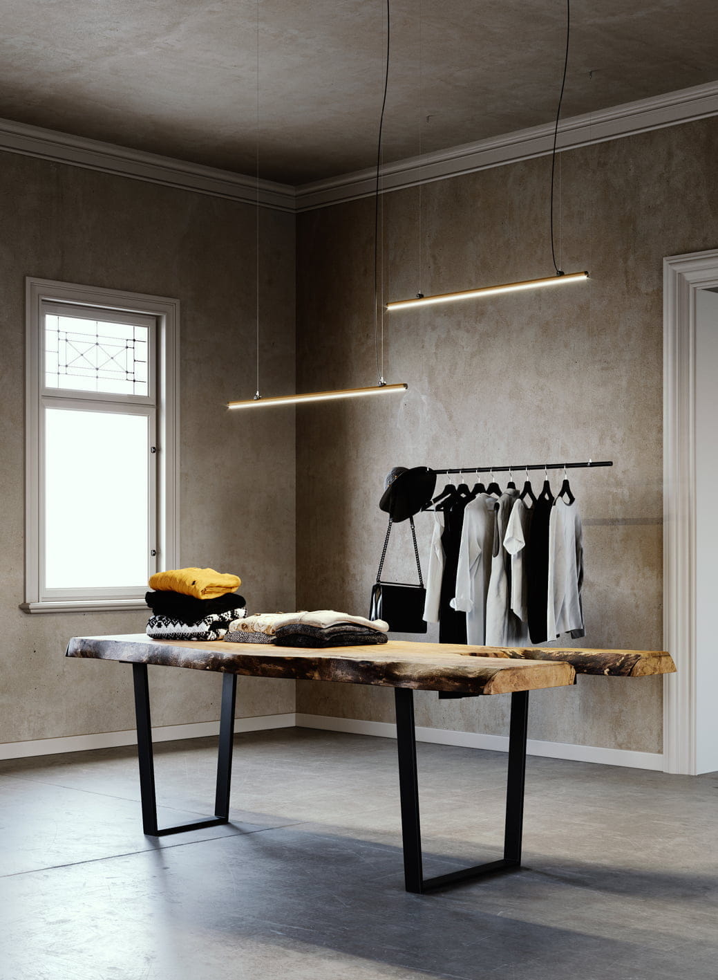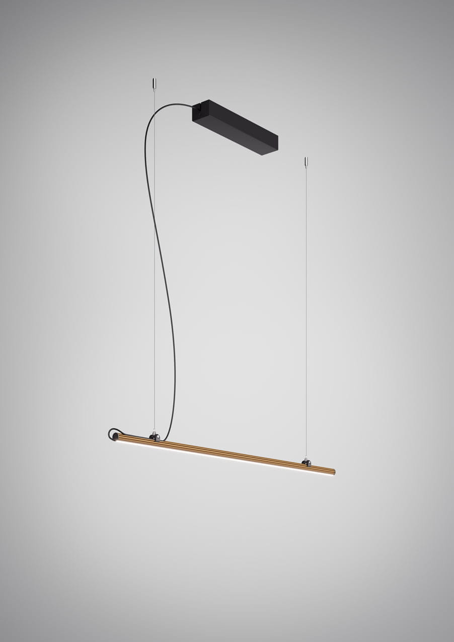 These pendant lamps, made of black anodised aluminium and bronze bars, are available in three sizes. The suspension bars can be oriented for downward or upward illumination. The electrification is mains voltage for LEDs, the power supply is through a driver that can be placed on the ceiling.