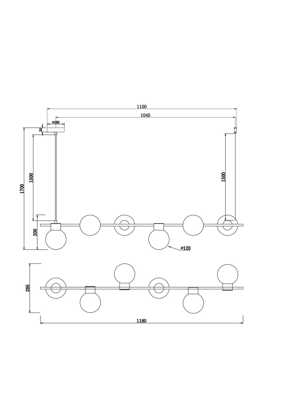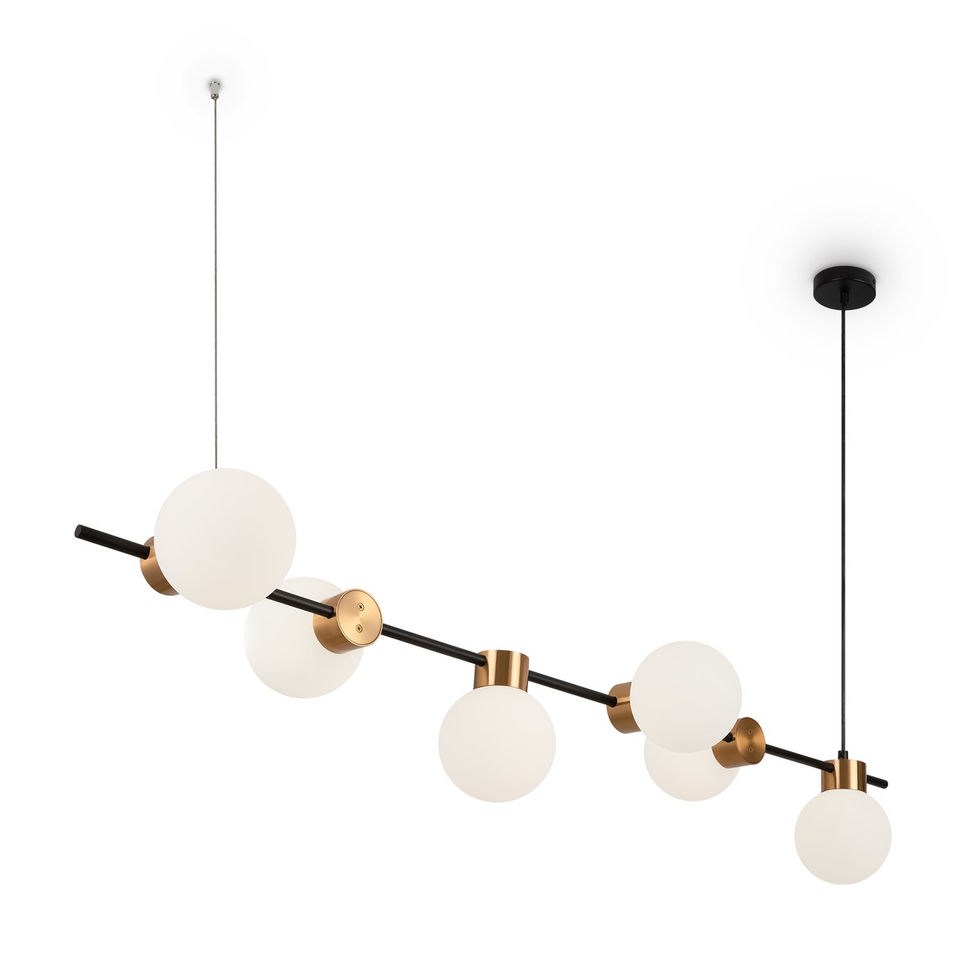 Подвесной светильник выполнен в виде горизонтальной металлической штанги с шестью шарообразными стеклянными плафонами, разнесёнными по длине и ориентированными в разные стороны, поэтому свет распределяется по пространству более равномерно, чем от одного центрального источника. В коллекции Freya Gatsby сочетание чёрной арматуры и латунных акцентов подчёркивает графичную конструкцию, а матовые белые плафоны работают как рассеиватели, скрывая лампу и смягчая поток. В реальном сценарии модель размещают над обеденным столом или кухонным островом: свет охватывает всю длину поверхности, и при перемещении людей вокруг стола не возникает резких теней по краям. Шесть патронов G9 позволяют собрать суммарную мощность до 25 Вт, распределённую по нескольким точкам, что делает свет более пластичным и комфортным для глаз. Длина конструкции помогает использовать подвес как основной свет в вытянутом помещении без дополнительной линии спотов. IP20 предполагает установку в сухих жилых интерьерах.