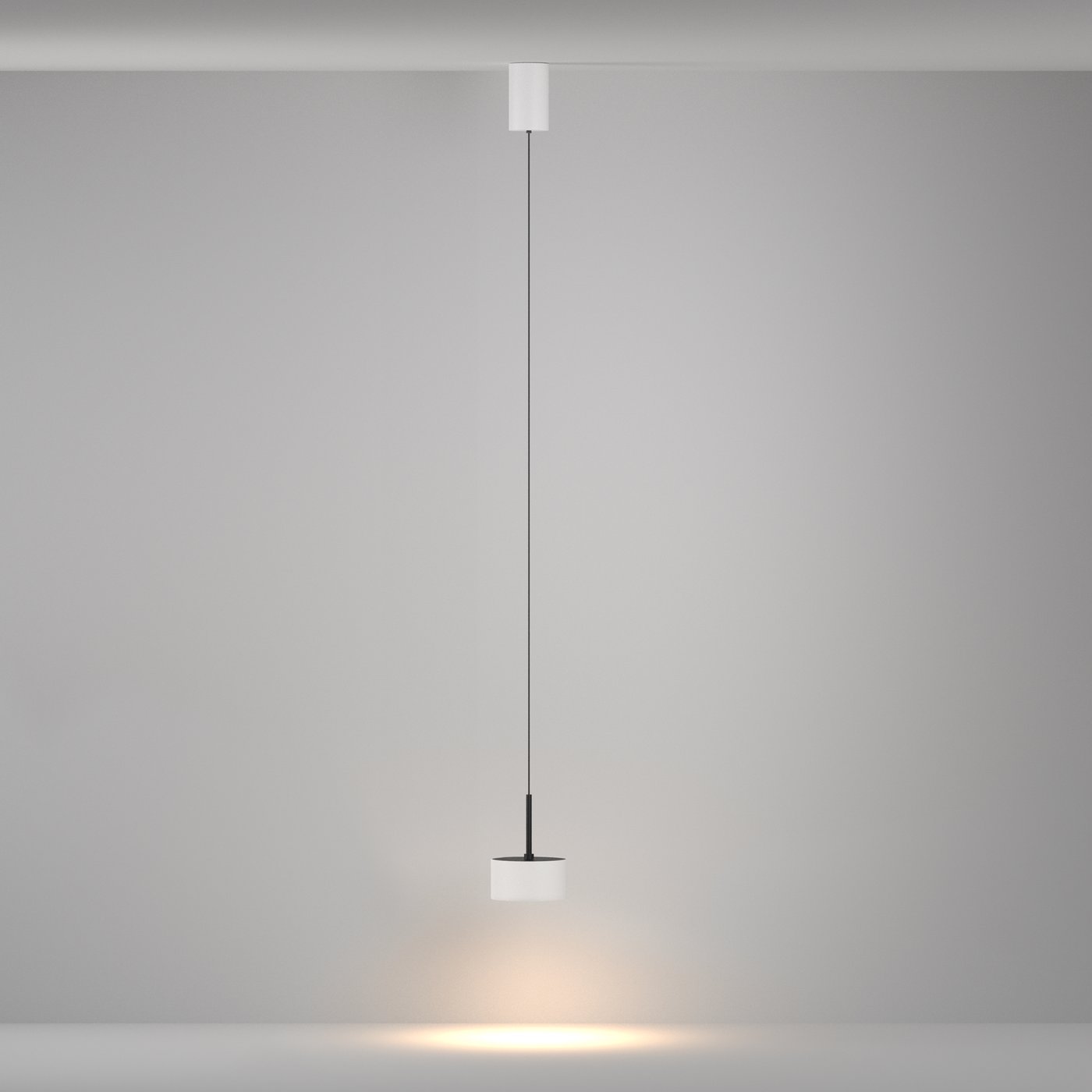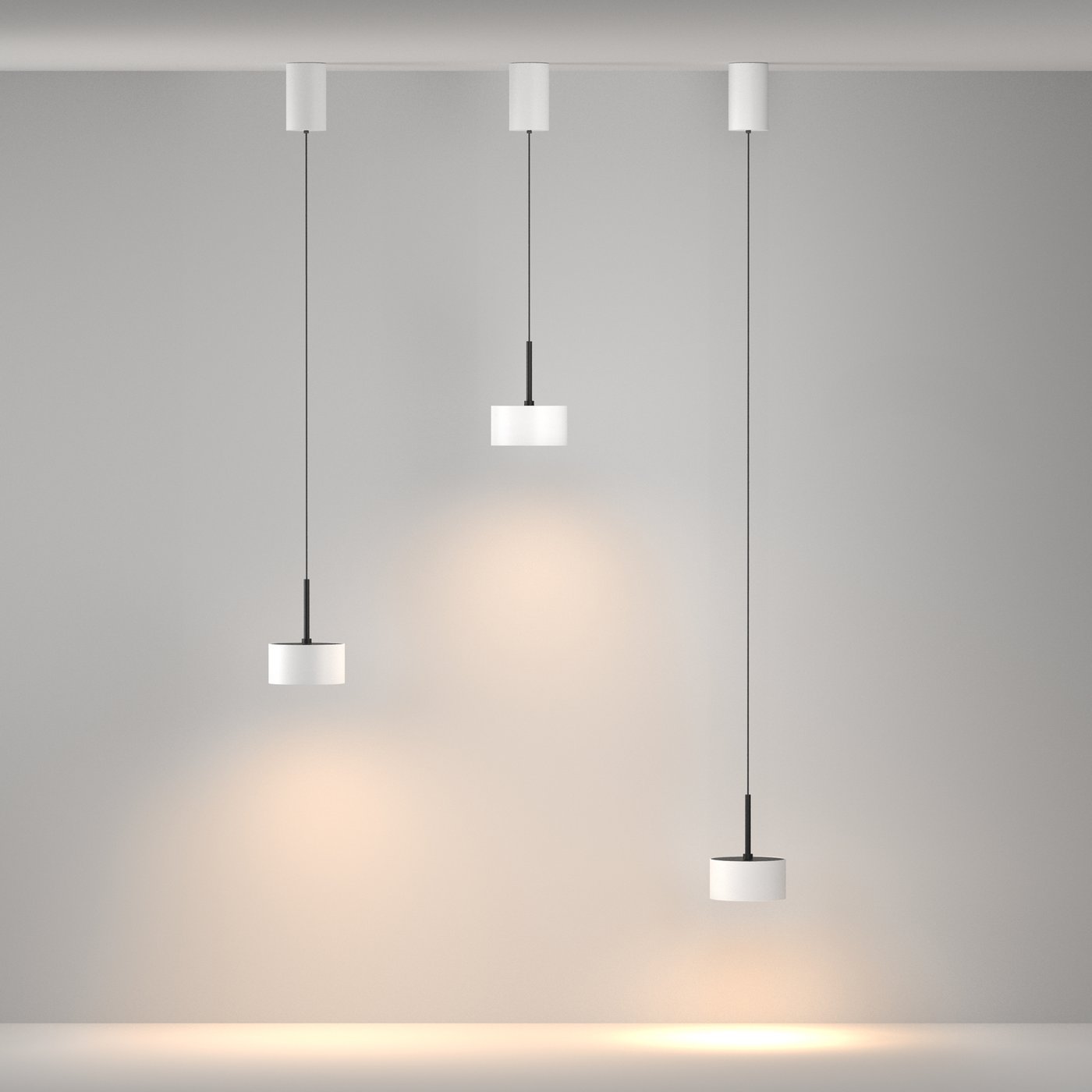 Подвес представляет собой компактный цилиндрический светильник с матовым рассеивателем, подвешенный на регулируемом по высоте кабеле, что сразу задаёт его как источник направленного, но комфортного света вниз. В коллекции Glare производителя Maytoni форма и оптика рассчитаны на работу вблизи человека — над столешницей, барной стойкой или прикроватной зоной, где свет воспринимается с близкой дистанции. Широкий угол 120° распределяет поток по поверхности без резкого пятна, поэтому при движении руки по столу освещённость остаётся равномерной, а голова не попадает в зону слепящего блика. Антибликовый матовый рассеиватель снижает контраст яркости, благодаря чему светильник можно размещать на уровне глаз, не испытывая дискомфорта при взгляде вверх. Световой поток 640 лм при мощности 12 Вт работает как локальное освещение, достаточное для еды, чтения или работы с предметами, а индекс цветопередачи Ra 90 сохраняет натуральные оттенки материалов. Температура 3000 K даёт тёплый спокойный свет, а совместимость с DALI и Triac позволяет менять яркость и характер освещения в зависимости от времени суток и сценария использования.