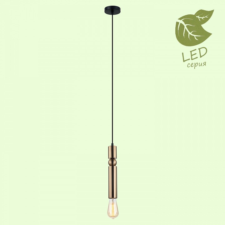 Подвесной светильник с одиночным источником света, выполненный в виде вытянутого цилиндрического корпуса на кабельной подвеске общей высотой 1500 мм. Основной элемент — узкий металлический корпус диаметром 50 мм с глянцевым покрытием в бронзовом цвете, дополненный декоративным шарообразным соединением в верхней части. Внизу установлен патрон E27 с открытой лампой, что формирует направленное вниз освещение без рассеивателя. В комплекте предусмотрена светодиодная лампа мощностью 10 Вт с цветовой температурой 4100K и световым потоком 920 лм. Крепление осуществляется на монтажной пластине, степень защиты IP20. За счёт компактного диаметра и большой высоты подвеса подходит для точечного освещения, в том числе в прихожей.