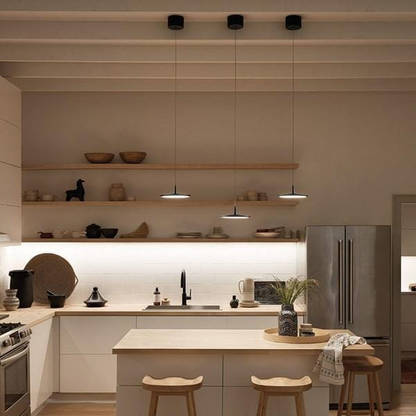 Простой внешний вид тоже может привлекать внимание. Матовая черная отделка Jeno и белый акриловый рассеиватель в сочетании с формой диска и конической деталью верхней части светильника создают подвесной светильник, обеспечивающий функциональное освещение и фокусирующий элемент.