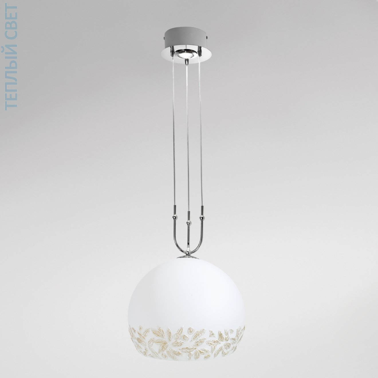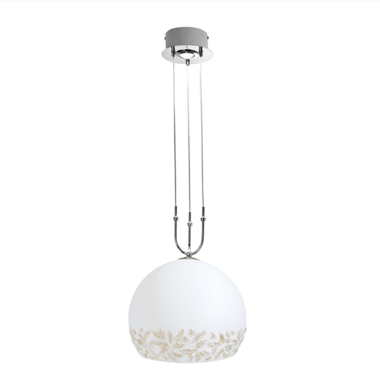 Подвесной светильник с одним основным плафоном и дополнительным источником света, рассчитанный на установку от потолка с регулируемой высотой подвеса от 60 до 200 см. Конструкция построена на круглой потолочной чаше с хромированным покрытием и трёх тонких тросах, сходящихся к держателю плафона. Плафон шарообразной формы диаметром около 40 см, выполнен в белом цвете с декоративным орнаментом в нижней части. Внутри предусмотрено два типа ламп с цоколями E27 и GU10, что задаёт комбинированный сценарий освещения. Светильник используется как центральный подвес в жилых помещениях, где важны регулируемая высота и распределение света через закрытый рассеиватель.
