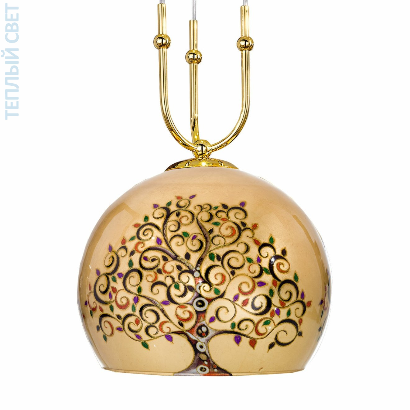 Подвесной светильник Kolarz из коллекции Luna предназначен для потолочного монтажа и используется для локального освещения с акцентом на декоративный плафон. Конструкция включает круглое основание и три подвеса, сходящиеся к корпусу, что формирует вытянутую вертикальную схему подвеса. Основной элемент — шарообразный плафон диаметром около 30 см с покрытием под золото 24 карата и ручной росписью в декоре ALBERO MULTI, где на поверхности изображён многоцветный орнамент с древовидным мотивом. Высота регулируется до 200 см при минимальном опуске 60 см. Внутри размещены два источника света с цоколями E27 и GU10.
