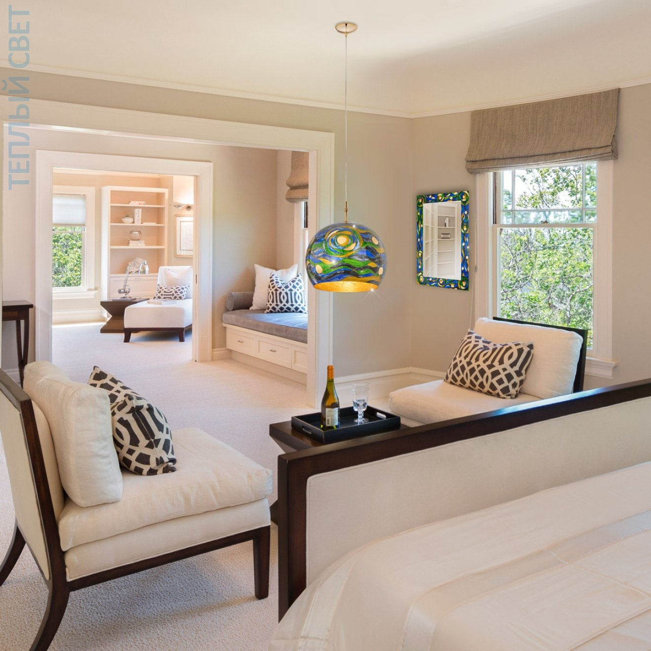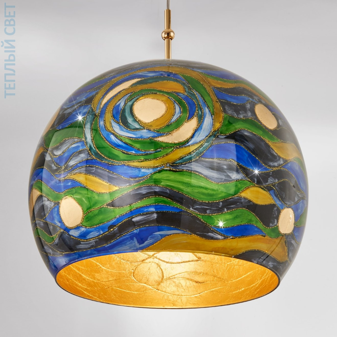 Подвесной светильник с шарообразным стеклянным плафоном используется для локального освещения и крепится к потолку на регулируемом подвесе. Конструкция включает металлическое основание с отделкой под золото и плафон диаметром 40 см с многоцветной декоративной росписью, формирующей сложный узор с преобладанием синих и зелёных оттенков. Внутри устанавливается одна лампа с цоколем E27, свет выходит преимущественно вниз через нижнюю часть плафона, создавая направленный поток. Максимальная высота подвеса достигает 200 см, что позволяет регулировать положение светильника и использовать его в жилых зонах и над столами.