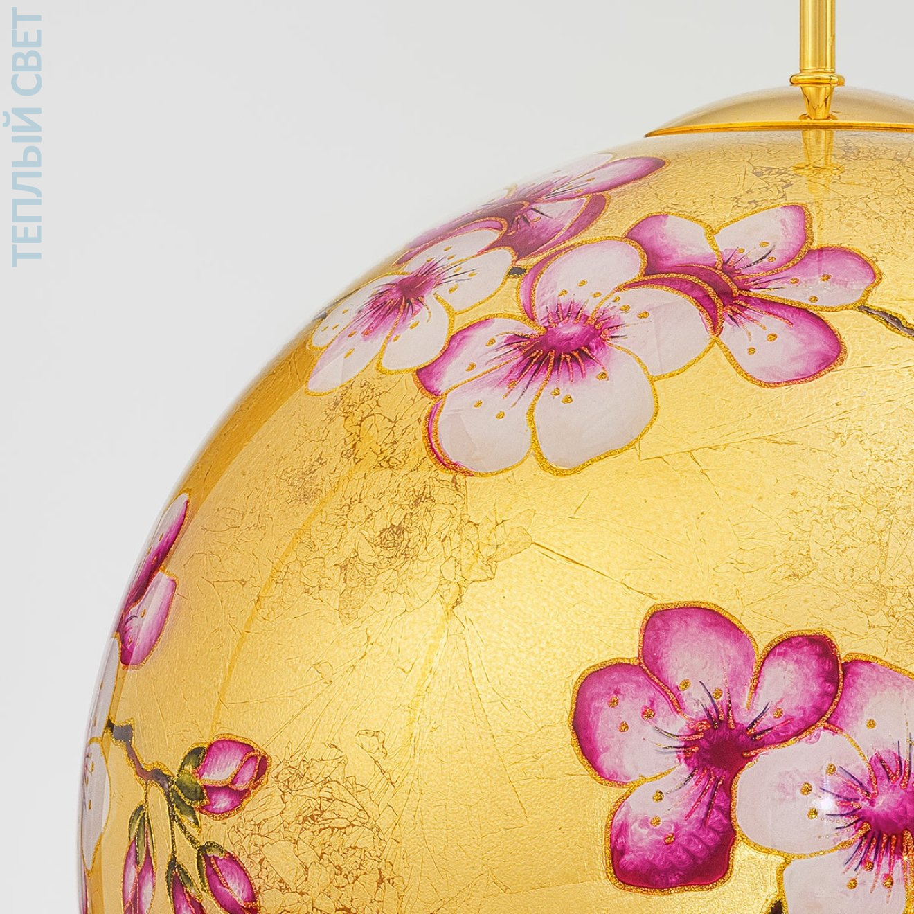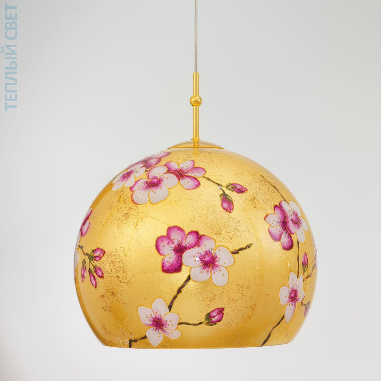 Подвесной светильник с шарообразным плафоном предназначен для локального освещения и крепится к потолку на регулируемом подвесе. Конструкция включает металлическое крепление с отделкой под золото и стеклянный плафон диаметром 40 см, покрытый декоративной росписью с цветочным орнаментом на золотом фоне. Внутри устанавливается одна лампа с цоколем E27, свет выходит преимущественно через нижнюю часть, формируя направленный поток вниз. Максимальная высота подвеса достигает 200 см, что позволяет изменять положение светильника и использовать его в жилых помещениях над столами или в зонах с акцентным освещением.