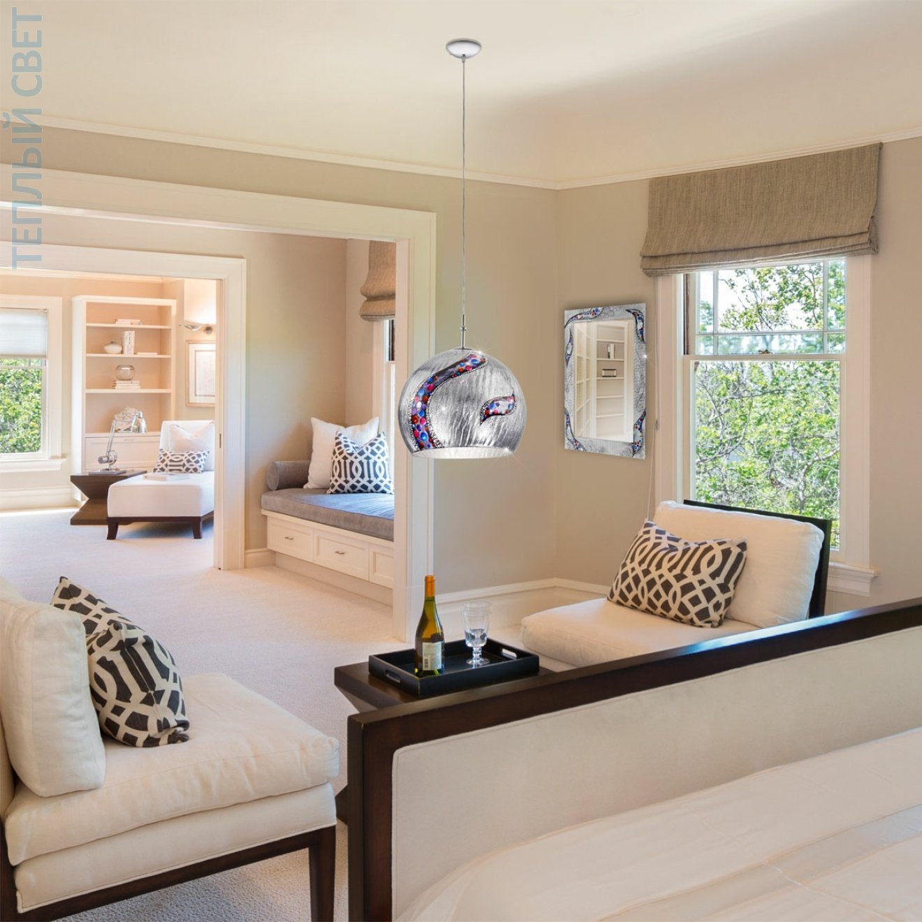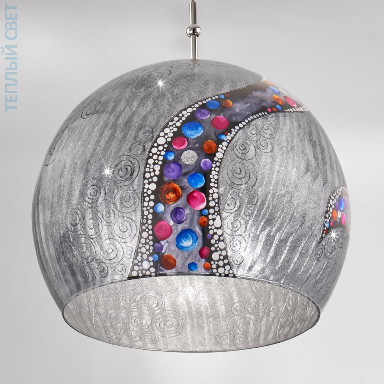 Подвесной светильник с шарообразным плафоном используется для локального освещения и подвешивается к потолку на кабеле с возможностью регулировки высоты. Конструкция включает стеклянный плафон диаметром 40 см с выраженной декоративной отделкой и металлическое крепление в хромированном исполнении. Поверхность плафона украшена сложным рисунком с цветными вставками, что влияет на характер распределения света и создаёт акцент при включении. Внутри устанавливается одна лампа с цоколем E27, свет направлен преимущественно вниз. Максимальная высота подвеса достигает 200 см, что позволяет использовать светильник над столами и в жилых зонах.