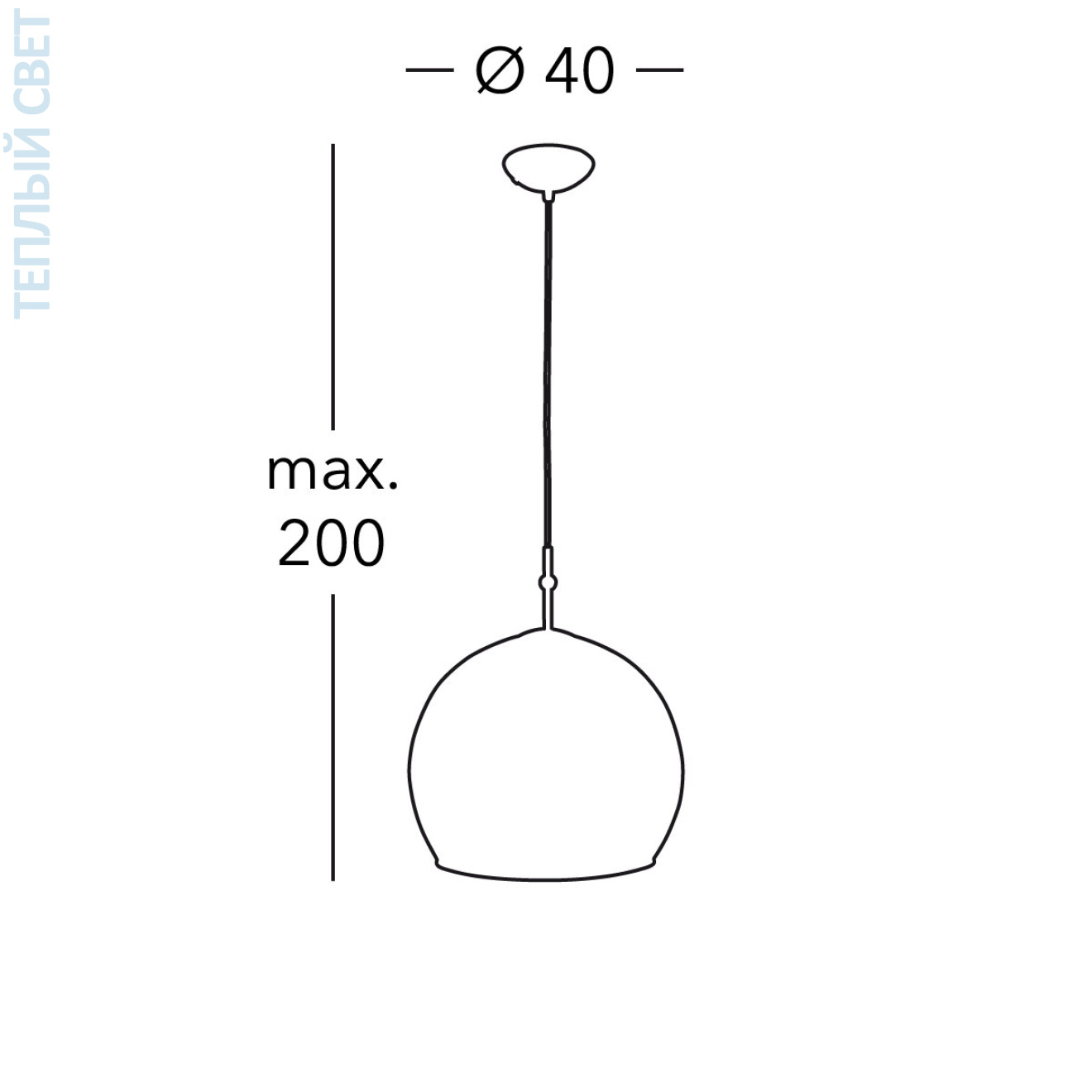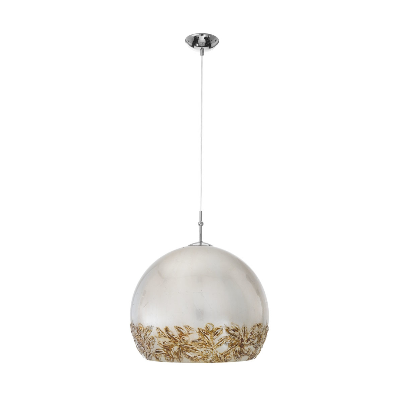 Подвесной светильник с шарообразным стеклянным плафоном используется для локального освещения и подвешивается к потолку на регулируемом тросе. Конструкция включает металлическое крепление в хромированном исполнении и плафон диаметром 40 см с матовой поверхностью и декоративным орнаментом в нижней части. Внутри устанавливается одна лампа с цоколем E27, при этом свет выходит преимущественно вниз через открытую часть, формируя направленное освещение. Максимальная высота подвеса достигает 200 см, что позволяет изменять положение светильника и использовать его над столами или в зонах с акцентным освещением.