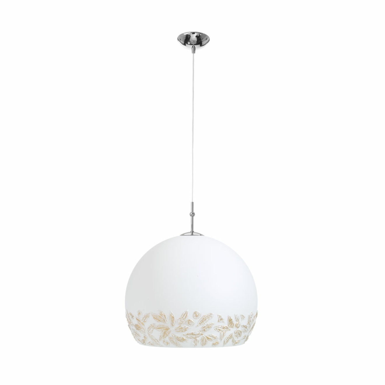 Подвесной светильник с шарообразным плафоном предназначен для локального освещения и размещается на потолке с помощью регулируемого подвеса. Конструкция включает стеклянный плафон диаметром 40 см с матовой поверхностью и декоративным орнаментом по нижнему краю, а также металлическое крепление в хромированном исполнении. Внутри используется одна лампа с цоколем E27, свет направляется вниз через открытую нижнюю часть плафона. Максимальная высота подвеса достигает 200 см, что позволяет адаптировать положение светильника под высоту помещения и использовать его над столами или в зонах с направленным освещением.