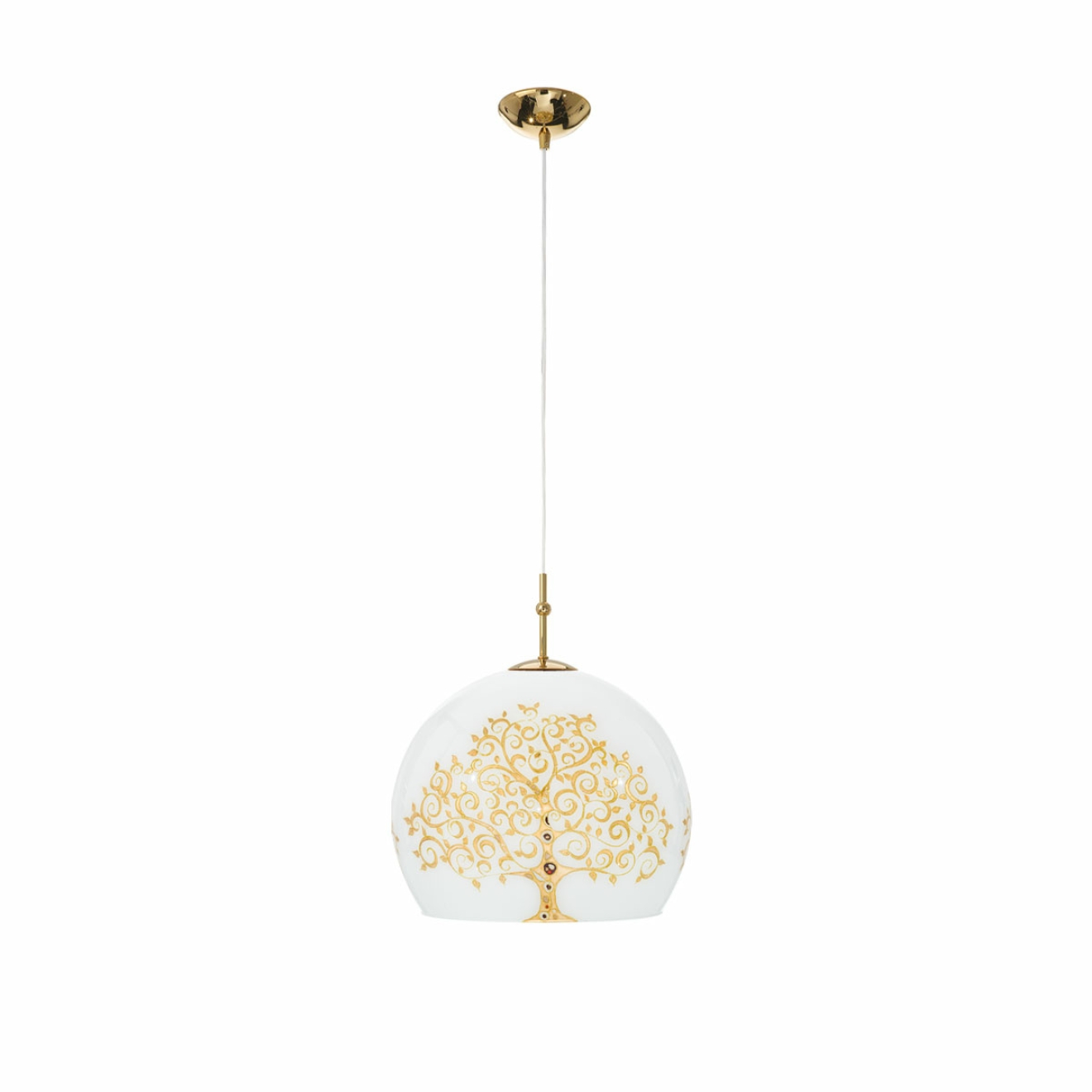 Подвесной светильник предназначен для потолочной установки и оснащён одной лампой с цоколем E27. Сферический купол диаметром 30 см выполнен из материала с покрытием золота 24 карата и оформлен ручной росписью декоративного мотива ALBERO GOLD с изображением стилизованного дерева на белом фоне. Максимальная длина подвеса составляет 200 см, что позволяет регулировать высоту размещения в помещении. Конструкция включает потолочный крепёж, регулируемый подвесной шнур и декоративный плафон, формирующий основной световой поток. Основные параметры — диаметр купола, высота подвеса, материал покрытия и уникальная художественная отделка.