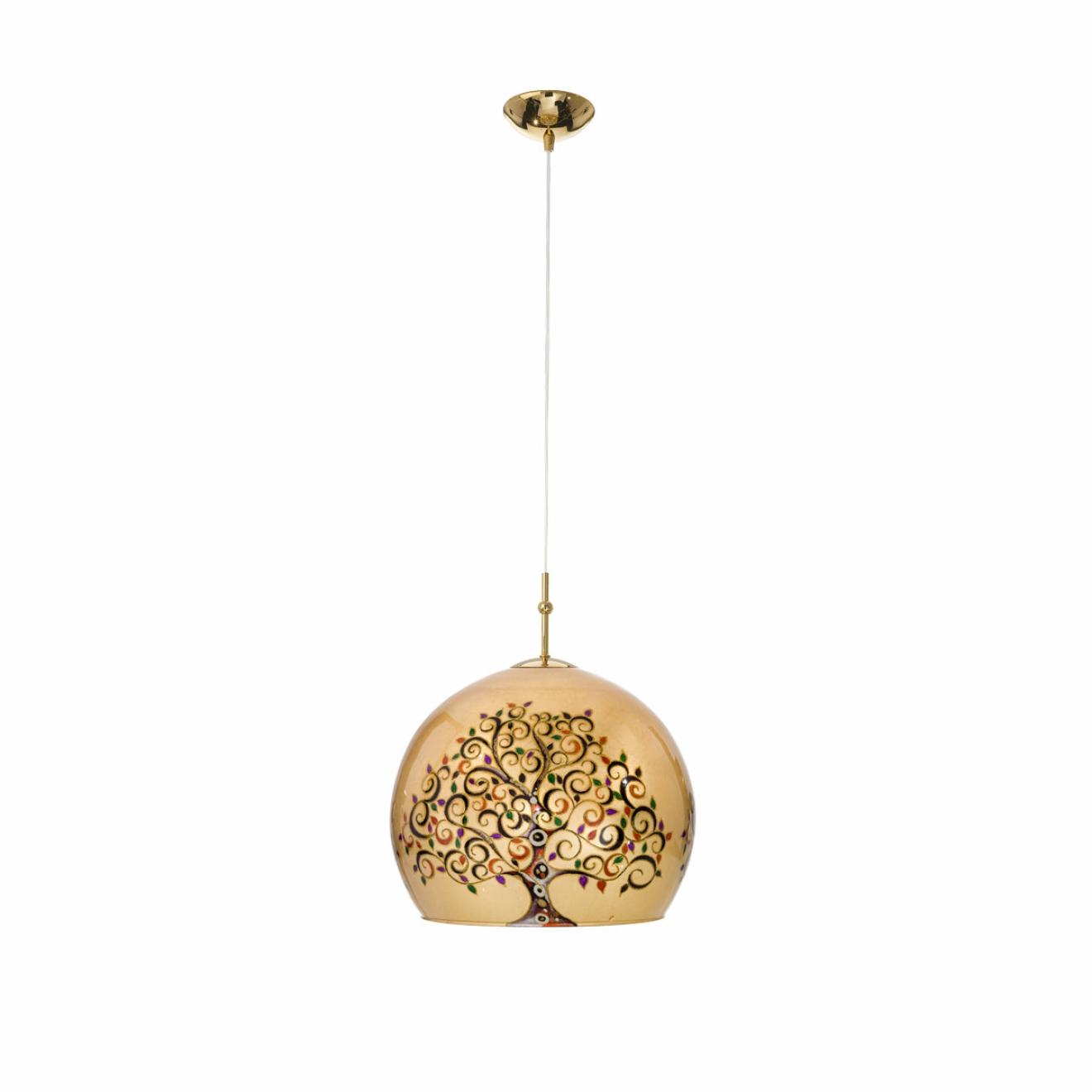 Подвесной светильник предназначен для потолочной установки и оснащён одной лампой с цоколем E27. Сферический купол диаметром 30 см покрыт золотом 24 карата и оформлен ручной росписью с декоративным мотивом ALBERO MULTI, изображающим стилизованное дерево с разноцветными листьями. Максимальная длина подвеса составляет 200 см, что позволяет регулировать высоту размещения в интерьере. Конструкция включает потолочный крепёж, регулируемый шнур и декоративный плафон, формирующий основной световой поток. Основные параметры — диаметр купола, высота подвеса, материал покрытия и уникальная художественная отделка.