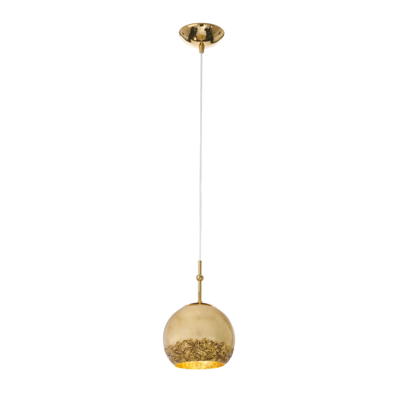 Подвесной светильник рассчитан на одну лампу с цоколем E27 и оснащён регулируемым по длине подвесом до 200 см, что позволяет адаптировать высоту установки под интерьер. Абажур сферической формы диаметром 20 см выполнен из стекла с позолотой 24 карата и декоративной состаренной отделкой в нижней части. Крепление к потолку осуществляется через металлическую планку, а прозрачный кабель поддерживает визуальную лёгкость конструкции. На интерьерной фотографии видно, что светильник подвешен над зоной столовой, демонстрируя компактный размер и декоративную роспись абажура, которая является ключевым конструктивным и визуальным элементом изделия.