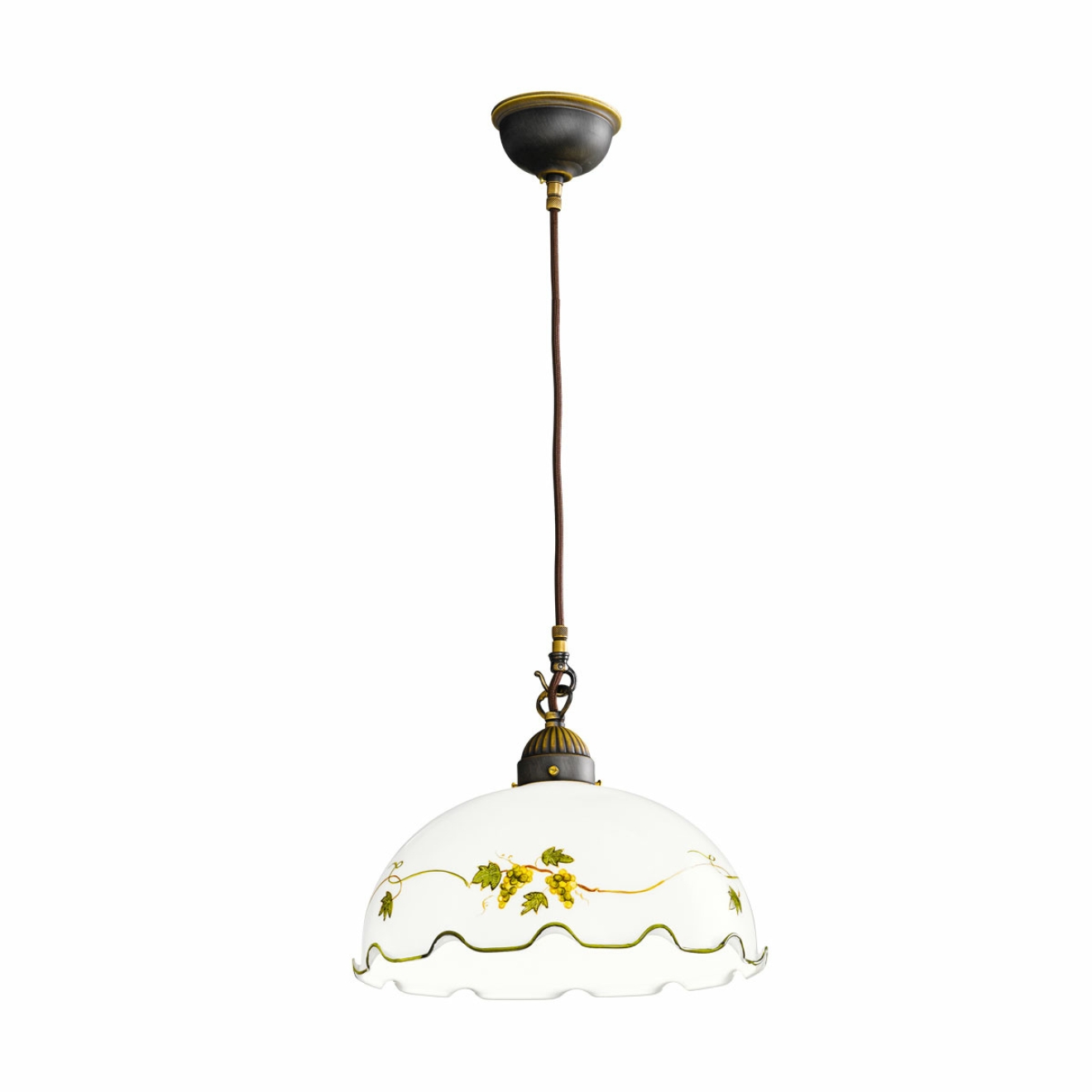 Подвесной светильник изготовлен из состаренной латуни с полусферическим абажуром диаметром 30 см и высотой 26 см, закрепленным на регулируемом шнуре длиной от 36 до 103 см. Конструкция рассчитана на одну лампу с цоколем E27, обеспечивая стандартное подключение к сети. Абажур имеет декоративные волнообразные края и рисунок с цветами и листьями, металлический крепеж поддерживает устойчивость плафона. Регулируемая длина подвеса позволяет адаптировать светильник к разной высоте потолков и размещать его над столом или в центральной зоне комнаты, сочетая функциональное освещение с декоративным элементом.