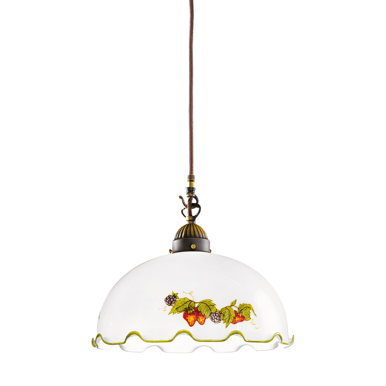 Подвесной светильник выполнен из состаренной латуни с полусферическим абажуром диаметром 30 см и высотой 26 см, закрепленным на регулируемом шнуре, который позволяет изменять общую длину от 36 до 103 см. Конструкция рассчитана на одну лампу с цоколем E27, обеспечивая стандартное подключение. Абажур имеет декоративные волнообразные края и рисунок с ягодами и листьями, металлический крепеж поддерживает устойчивость плафона. Регулируемая высота подвеса позволяет адаптировать светильник к различным потолкам и размещать его над столом или в центральной зоне помещения, обеспечивая функциональное освещение и декоративный элемент.
