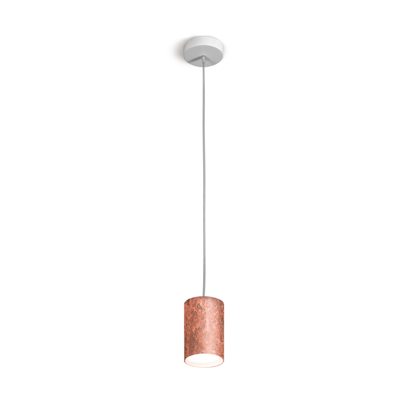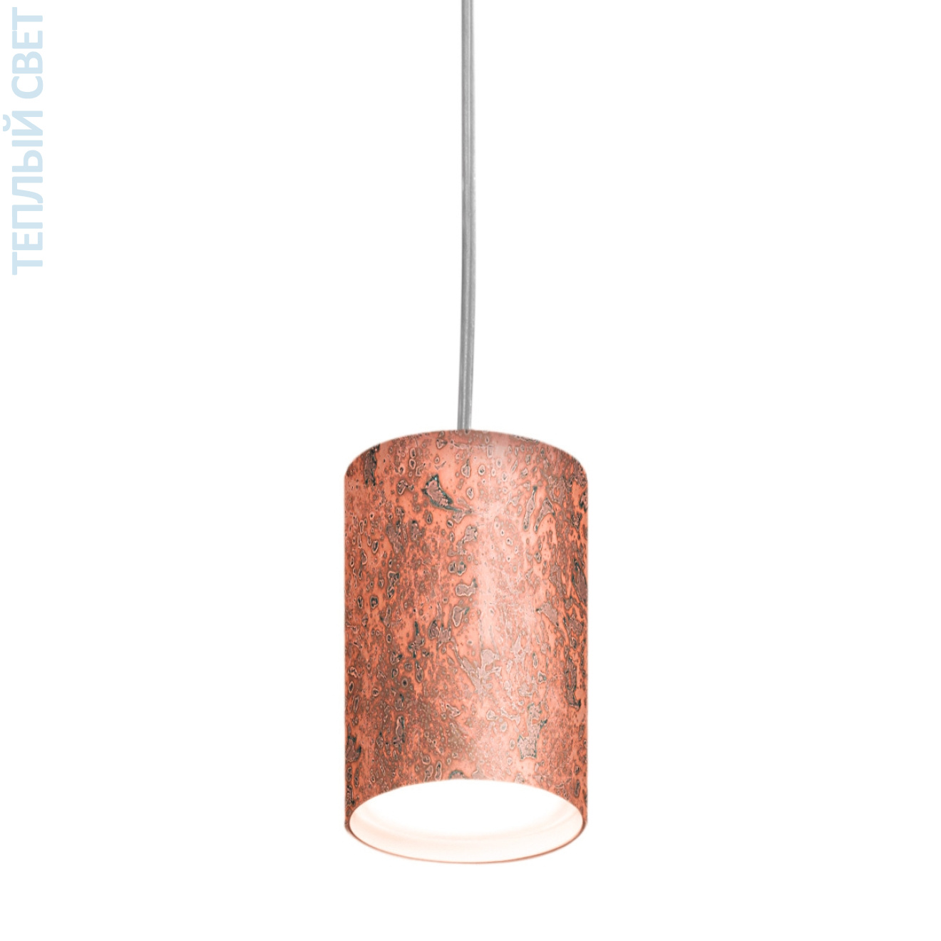 Подвесной светильник с компактным цилиндрическим плафоном диаметром около 8 см, предназначен для локального направленного освещения и использования в одиночных или групповых подвесах. Корпус выполнен с отделкой под медь с фактурной поверхностью, внутри установлен источник света с цоколем GX53, закрытый плоским рассеивателем. Конструкция включает потолочное основание и подвес на кабеле с минимальной высотой около 150 см, регулируемой при установке. Небольшой размер и направленный световой поток делают модель удобной для точечной подсветки рабочих поверхностей или формирования линейных световых композиций.