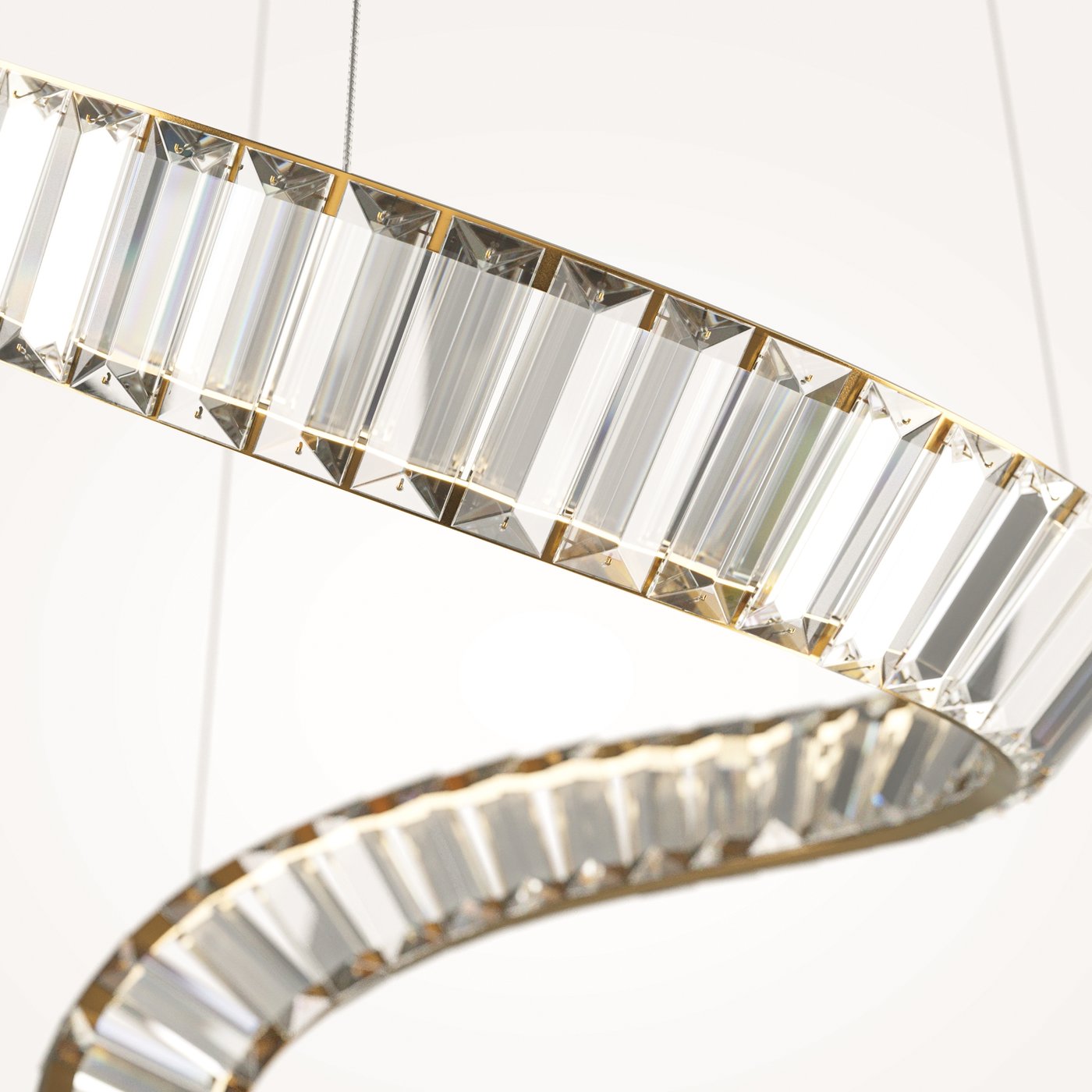 Подвесной светильник выполнен как вертикальная спиральная лента, собранная из прозрачных хрустальных сегментов на металлическом основании в цвете латуни. В коллекции Maytoni Krone источник света интегрирован по всей длине, поэтому свет идёт не из одной точки, а из протяжённой линии и воспринимается как светящаяся скульптура в воздухе. В реальном сценарии модель хорошо работает в холле или над лестничным проёмом: при подъёме по ступеням свет сопровождает движение, а хрустальные грани дают множественные блики и меняют рисунок при смене угла взгляда. Угол рассеивания 180° обеспечивает широкое распределение и позволяет свету заполнять пространство вокруг, а не только освещать пол под подвесом. Световой поток 3300 лм при мощности 48 Вт даёт уровень, достаточный для основного света в зоне с высоким потолком, особенно если вокруг нет других источников. Цветовая температура 3000K делает свет тёплым и комфортным для жилых интерьеров, а степень защиты IP20 рассчитана на сухие помещения. За счёт встроенного LED-модуля не требуется подбор ламп, а массивная конструкция подчёркивает стационарный характер установки.