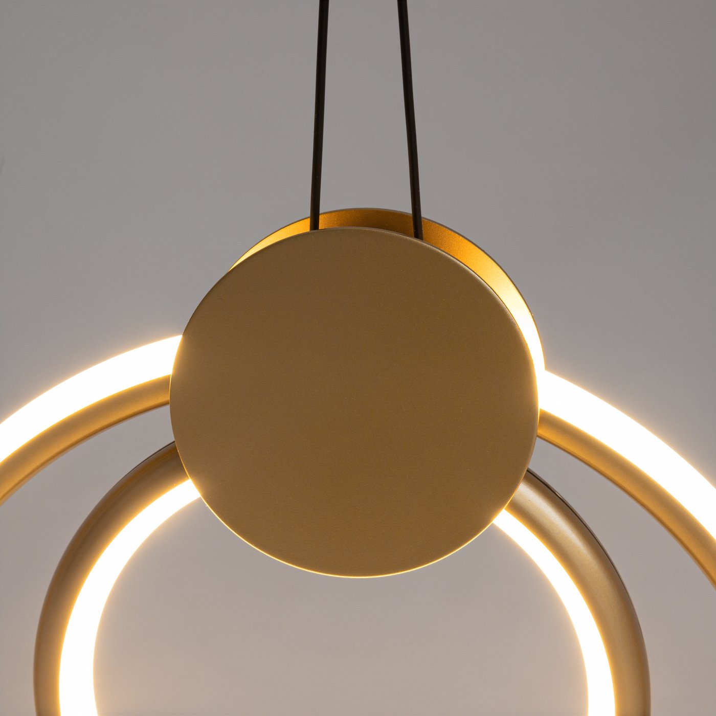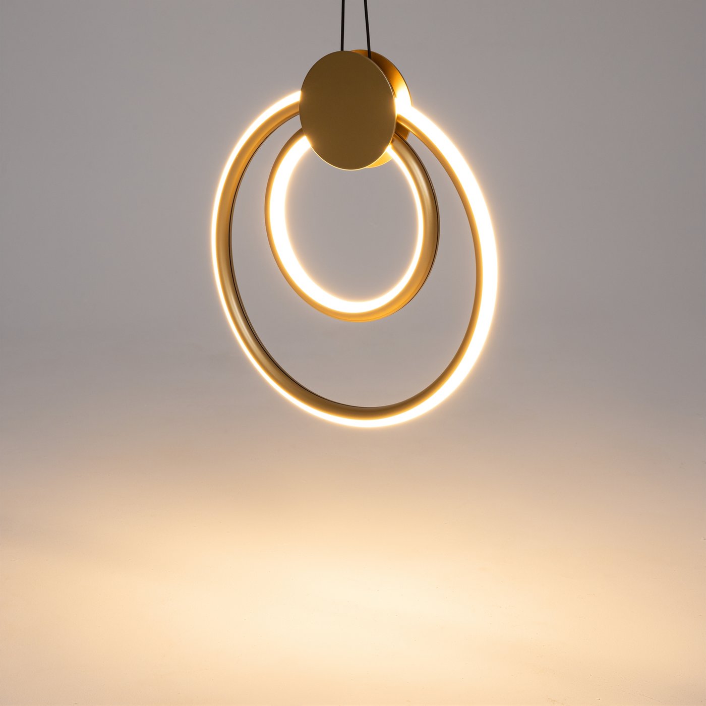 Подвес с двумя светящимися кольцами работает как локальный свет и подходит для зоны стола, прикроватной композиции или группы подвесов в гостиной. В коллекции Maytoni Link кольца закреплены на компактной латунно-чёрной арматуре и дают мягкое равномерное свечение по контуру, без яркой точки источника. Свет направлен в широком угле 125°, поэтому пятно на поверхности получается спокойным и растянутым, а при движении человека рядом свет не слепит и не даёт резких теней. Длина регулируемого провода до 3 метров позволяет опустить модель на нужную высоту, включая высокие потолки и лестничные пролёты. Световой поток 850 лм при мощности 20 Вт рассчитан на локальное освещение, когда светильник работает не один, а поддерживает общий свет в помещении. Тёплая температура 3000K подходит для вечерних сценариев, а индекс цветопередачи Ra 80 сохраняет естественность оттенков в жилом интерьере.