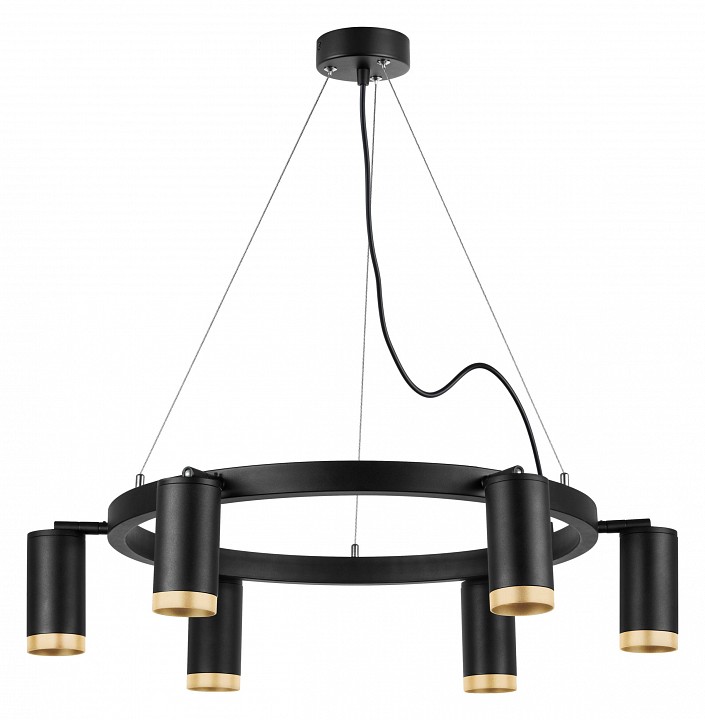 Подвесной светильник с кольцевой несущей рамой и шестью цилиндрическими поворотными плафонами рассчитан на потолочный монтаж и даёт направленный свет, который можно разворачивать в нужные стороны. Конструкция собрана из металлической арматуры чёрного цвета с золотистыми акцентами на торцах плафонов; по изображению видно, что светильник подвешивается на тросах, а подключение выводится от центральной потолочной чаши. Диаметр модели 860 мм, высота 455 мм, поэтому она работает как заметный центральный прибор для гостиной, кабинета или спальни. Используется шесть ламп с цоколем GU10 мощностью до 50 Вт каждая, лампы в комплект не входят. Для модели указана возможность диммирования, степень защиты IP20 и крепление на монтажной пластине.