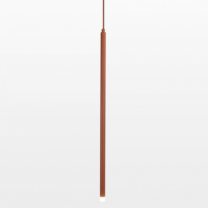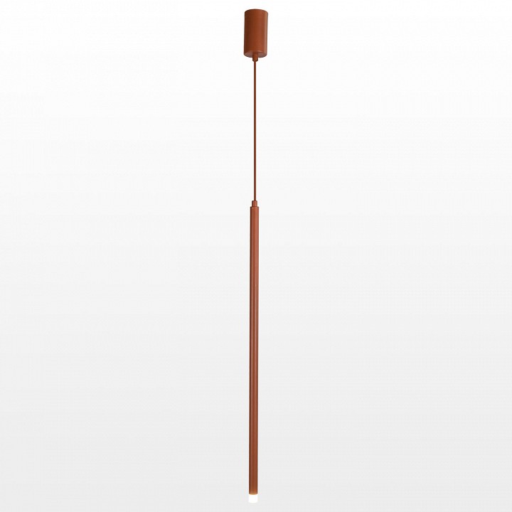Подвесной светильник с узким цилиндрическим корпусом, ориентированный на направленное точечное освещение вниз, подвешивается на кабеле с возможностью регулировки высоты. Конструкция выполнена из металла в терракотовом цвете с матовой поверхностью и занимает минимальный объём в пространстве за счёт вытянутой формы. Диаметр составляет около 200 мм, общая длина может достигать 1500 мм. Используется встроенный светодиод мощностью 3 Вт с тёплой цветовой температурой 3000K и световым потоком 300 лм. Питание от сети 220 В, светильник крепится на монтажную пластину и предназначен для использования в интерьере при степени защиты IP20.