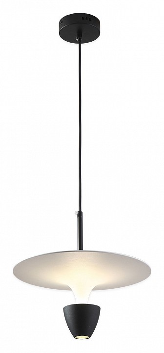 Подвесной светильник с регулируемой высотой используется для локального освещения и монтируется к потолку на монтажную пластину. Конструкция включает широкий круглый плафон диаметром около 300 мм с направлением света вниз и центральный нижний элемент, формирующий основной световой поток. Корпус выполнен из металла с матовой поверхностью, сочетает белый плафон и чёрную арматуру. Встроенный светодиодный источник мощностью 6 Вт обеспечивает световой поток 600 лм при цветовой температуре 4000 К. Высота подвеса регулируется, максимальный размер по высоте достигает 1650 мм. Степень защиты IP20 указывает на использование в сухих помещениях.