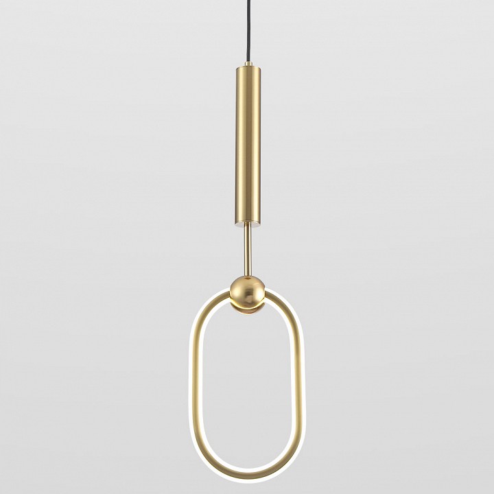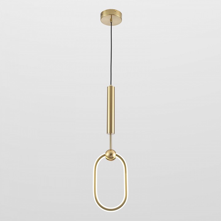 Подвесной светильник с линейной вертикальной композицией и овальным световым элементом, предназначенный для локального освещения и акцентного размещения в интерьере. Конструкция включает цилиндрический верхний корпус, от которого через подвесной кабель опускается декоративное кольцо с интегрированным светодиодным контуром. Световой элемент выполнен в форме вытянутого овала и обеспечивает рассеянное свечение в стороны. Модель оснащена встроенным LED-источником мощностью 13 Вт с цветовой температурой 4000K и световым потоком 1300 лм. Общая высота регулируется, максимальная достигает 2000 мм при размерах светового элемента 170×120 мм, что позволяет использовать светильник как одиночный акцент или в группе на разной высоте.