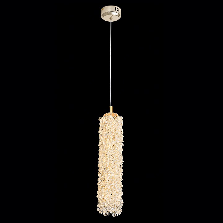Подвесной светильник с вытянутым цилиндрическим плафоном, сформированным из множества прозрачных элементов, создающих плотную фактурную оболочку вокруг источника света. Конструкция подвешивается на тросе с регулировкой высоты до 1500 мм, при этом сам плафон имеет диаметр около 100 мм и выраженную вертикальную ориентацию. Внутри установлен светодиодный источник мощностью 19 Вт с цветовой температурой 4000 К и световым потоком 1710 лм, обеспечивающий направленное освещение вниз и рассеивание через прозрачную структуру. Плафон выполнен из хрусталя, арматура металлическая с глянцевым покрытием в золотом цвете, степень защиты IP20 допускает использование только в интерьере.