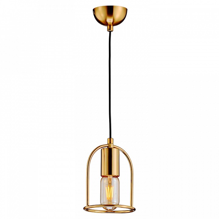 Подвесной светильник диаметром 120 мм и высотой 250 мм выполнен с металлической глянцевой арматурой золотого цвета, включающей кольцевую конструкцию вокруг цоколя E27. Модель оснащена одной лампой накаливания или светодиодной мощностью до 40 Вт и регулируется по высоте при подвесе к потолку на монтажной пластине. Конструкция предназначена для установки в гостиной, кабинете или коридоре и создаёт направленное декоративное освещение. Основные характеристики для понимания товара — форма и материал арматуры, тип и мощность лампы, способ крепления и возможность регулировки высоты, которые определяют световой эффект и визуальное восприятие светильника.