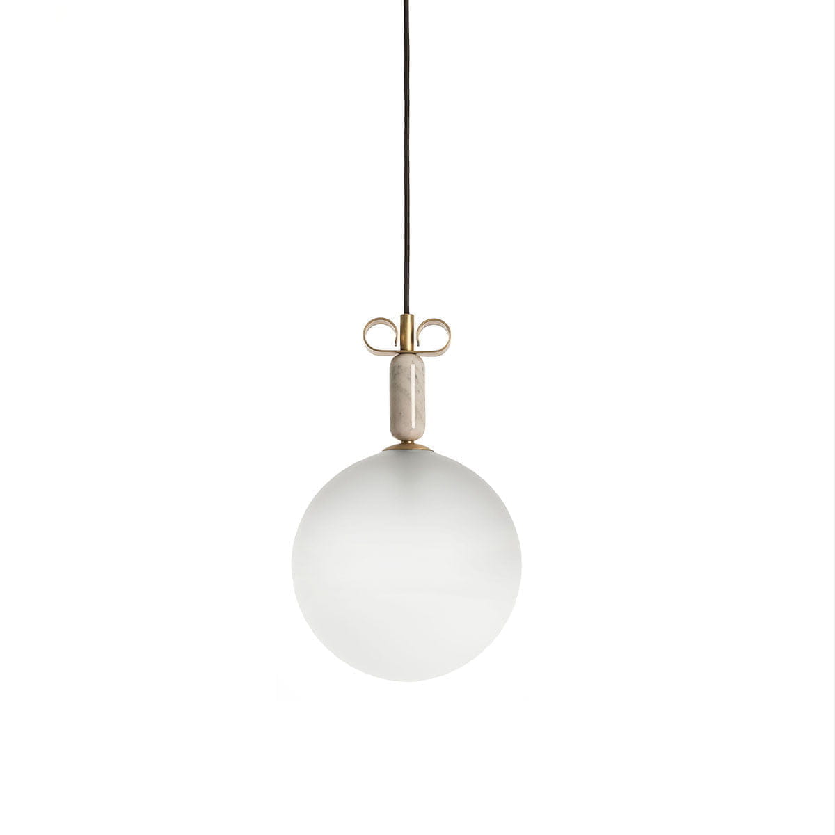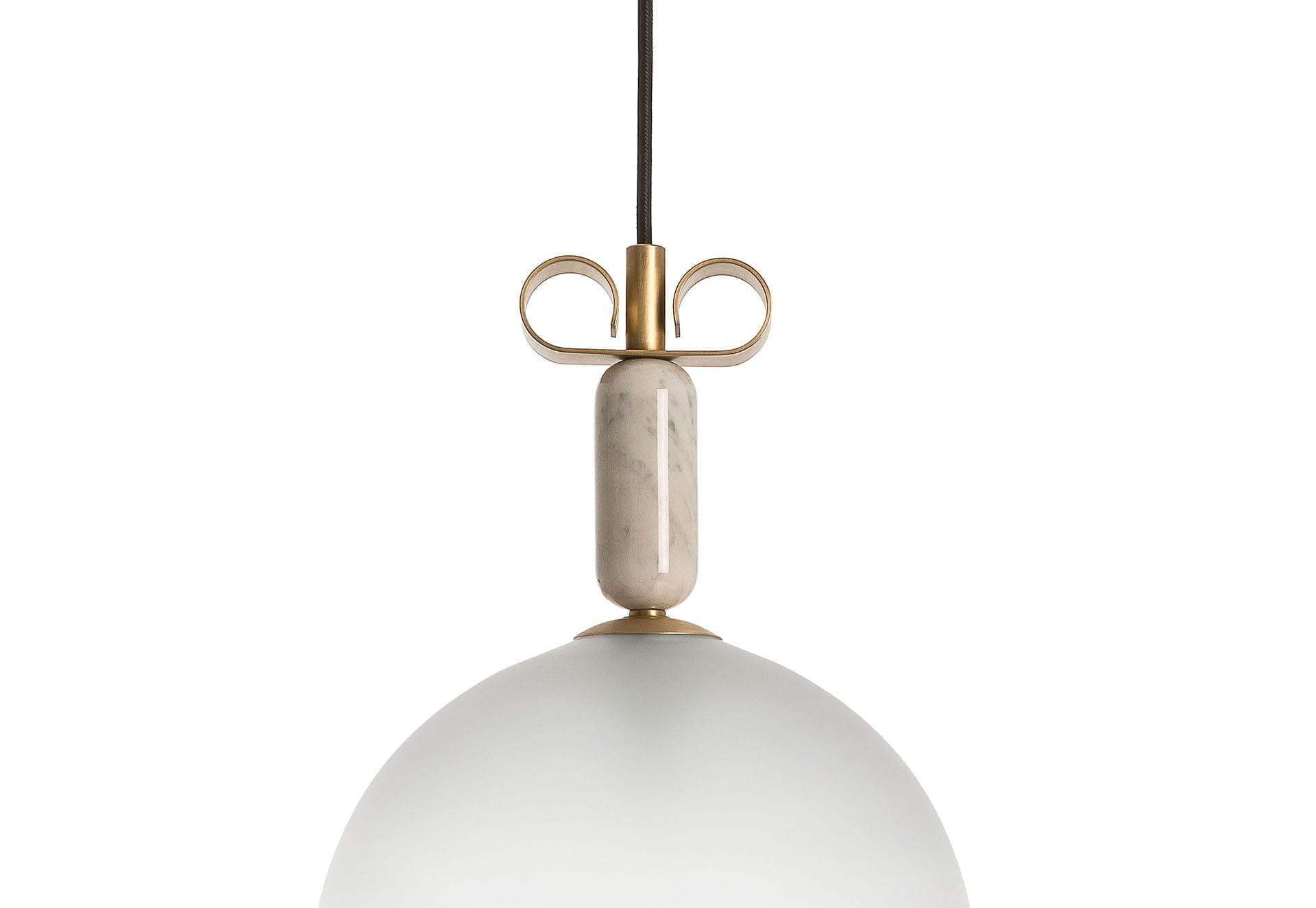 The allure of Bon Ton is enriched with a “precious” version in glass and marble, like an evening dress for special occasions that combines deco and lightness. The shaded glass sphere is available in pearl grey and pink and the marble element in white Carrara or alpine green. The detail of the brass ribbon, emblematic of the designer that brings to mind the earring, a symbol of elegance and femininity, has been retained in its original version. This is a work of light art where typical elements of the Italian style are reinterpreted gracefully in a contemporary and iconic way.
