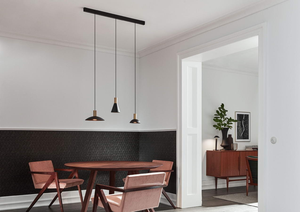 Подвесной светильник ODREY 1.7 выполнен в виде компактного металлического купола диаметром 150 мм, который собирает свет в нижней полусфере и удерживает его в зоне задачи. В коллекции Odrey от Wever & Ducre такая форма рассчитана на локальное освещение небольших поверхностей — прикроватной тумбы, журнального столика или участка барной стойки. При посадке за столом плафон частично экранирует лампу, поэтому свет не попадает прямо в глаза, а рабочее пятно остаётся контрастным и читаемым. Подвес работает на сменной лампе PAR16 с цоколем GU10, что удобно, если нужно выбрать конкретный угол луча: узкий для акцента на предметах или более широкий для повседневного света. Питание 100–240 В позволяет подключать модель в стандартной сети без дополнительных условий, а степень защиты IP20 предполагает использование только в сухих помещениях. Высота корпуса 125 мм делает силуэт аккуратным, поэтому несколько подвесов в ряд не перегружают интерьер даже при низкой посадке.