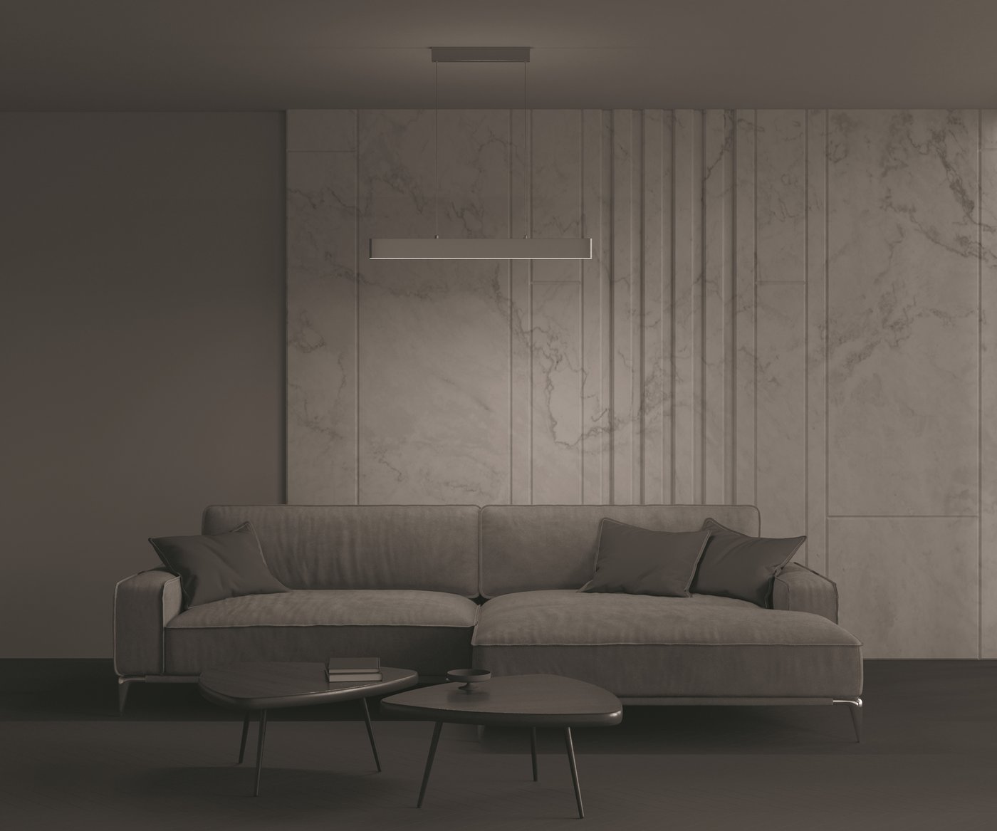 Подвесной светильник Step воспринимается как тонкая световая линия с выверенными пропорциями, где металл с благородным золотистым оттенком работает не как декор, а как спокойный архитектурный акцент. Лаконичный корпус вытянутой формы создаёт ощущение лёгкости и баланса, а мягкое свечение, скрытое за опаловым рассеивателем, делает свет визуально глубоким и собранным. Эта модель органично вписывается в современные интерьеры с чистой геометрией: над обеденным столом, кухонным островом, рабочей зоной или в гостиной, где важна аккуратная горизонталь света без перегруженности пространства. Подвес на тонких тросах позволяет точно задать высоту и встроить светильник в интерьер как самостоятельный элемент или часть линейной композиции. Тёплый свет с температурой 3000 К формирует комфортную атмосферу для жилых сценариев, а световой поток около 1100 люмен обеспечивает достаточную выразительность без излишней яркости. Встроенный LED-модуль с хорошей цветопередачей и широким углом рассеивания даёт ровное освещение, сохраняя визуальную цельность и спокойный характер пространства.