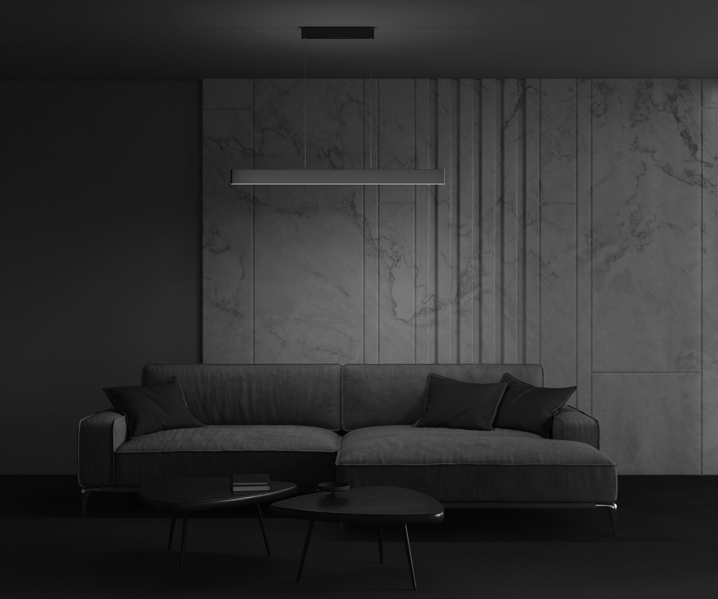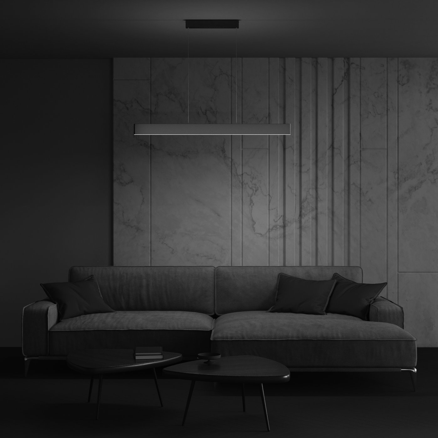 Линейный подвес выполнен в виде тонкой световой планки, подвешенной на двух тросах, поэтому в пространстве он читается как аккуратная горизонтальная линия без массивного корпуса. В серии Maytoni Step свет формируется встроенными SMD-светодиодами, закрытыми опаловым рассеивателем: он убирает точечность и даёт ровную светящуюся полосу по всей длине. В реальном сценарии подвес размещают над обеденным столом или рабочей поверхностью, и при движении рук по столешнице свет ложится равномерно, без резких теней и провалов по краям. Широкий угол 120° помогает заполнить зону мягким светом и снижает контраст, поэтому модель подходит для основного света в конкретной функциональной области. Световой поток 1400 лм при мощности 30 Вт рассчитан на комфортную освещённость стола, а температура 3000K даёт тёплый оттенок, уместный для жилых интерьеров. Длина кабеля 860 мм позволяет настроить высоту подвеса под посадку и высоту потолка, индекс цветопередачи Ra 80 ориентирован на бытовые задачи. Степень защиты IP20 предполагает установку в сухих помещениях.