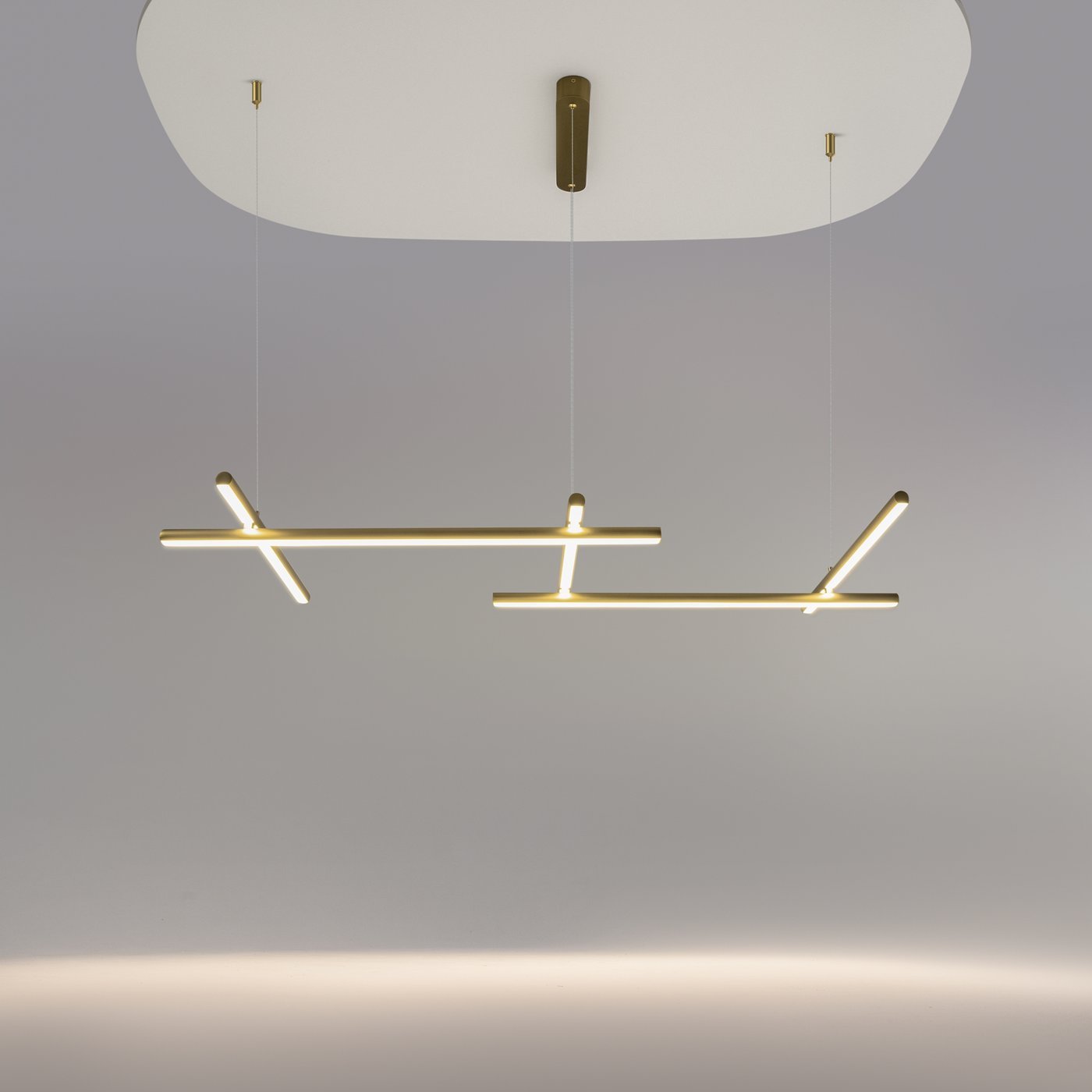 Подвесной светильник Radiance воспринимается как интерьерный объект с чёткой горизонталью: тонкая линейная форма собрана из металлических элементов и держится на почти незаметных подвесах, оставляя свету главную роль. Его характер — спокойный и собранный, рассчитанный на работу над плоскостью, а не на рассеивание по всему объёму комнаты. В реальном интерьере его опускают над обеденным столом или длинной кухонной островной столешницей, выверяя высоту уже на этапе расстановки мебели. Вечером свет включают в момент сервировки, и он равномерно ложится вдоль поверхности, не ослепляя сидящих и не дробя пространство. Поток около 2150 люменов распределяется широким углом, поэтому стол освещается без провалов по краям. Тёплая температура порядка 3000 К и силиконовый рассеиватель дают мягкий, собранный свет, подходящий для длительных ужинов и неспешных разговоров.